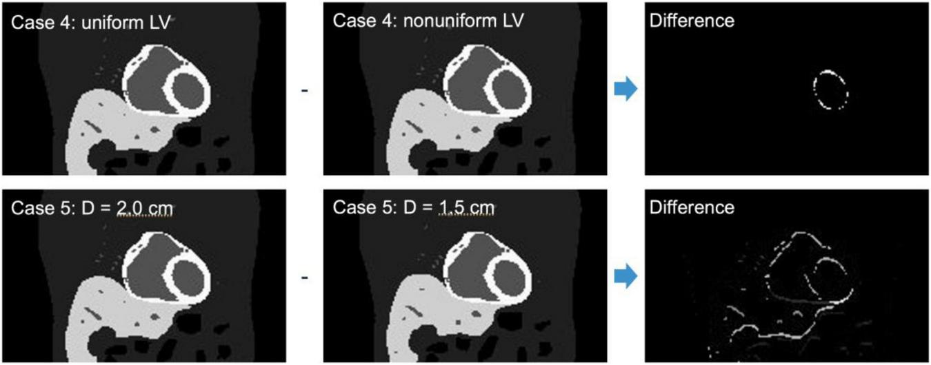 We have also simulated the effect of LV wall non-uniformity (Case 4) as well as the variation in the diaphragm motion (Case 5) for a fixed TBR = 8 (Figure 6). These cases are summarized in Table 2. All simulations were performed in parallel on the high-performance computing clusters in our lab with Xeon (Intel) series CPUs. The output format from the MC simulation can be configured in the fully LM format with information of each photon with the temporal, cardiac-respiratory tag or binned data at a given angle position and the tag of cardiac-respiratory phase. We used binned data with a temporal resolution of 0.125 s in the output of the projection with a detector pixel bin size of 4.4 mm for the reconstruction.