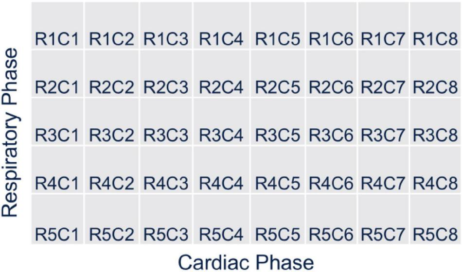 Gating scheme for the reconstruction: There are 8 cardiac and 5 respiratory gates corresponding to 40 gates for each 4D XCAT phantom configuration.