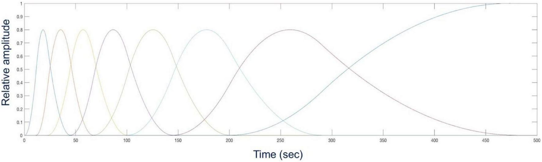 A representative set of temporal cubic B-spline basis functions that were optimized for a specific input time activity curve (TAC) in Figure 3.