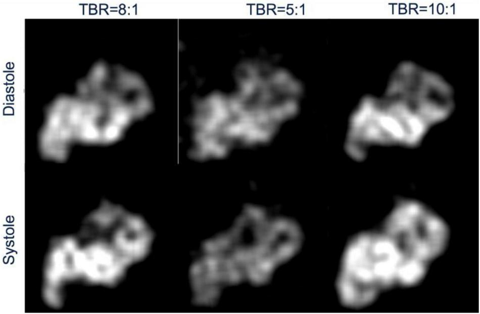 Reconstructed image of myocardial activity distribution during diastole and systole phases of the heart for three different TBRs at full exhalation.