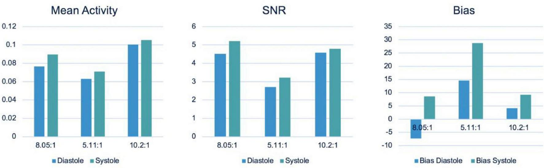 Figure 12 shows the detailed results of the statistical analysis of the reconstructed image for 3 different TBRs, namely Mean Stabilized Activity (MSA), SNR and Bias (%) at systolic and diastolic phases of the heart. The MSA and SNR were higher for a higher TBR while biases were improved for a higher TBR. There is no statistical difference between SNR at the TBRs = 8 and 10 (P = NS) while the SNR is decreased significantly for TBR = 5 compared to TBR = 8 (P < 0.001) with better bias-noise characteristics. This indicates that the TBR = 8 is sufficient to test the algorithm. Also, the variances were higher at TBR = 5 compared to 8 and 10.