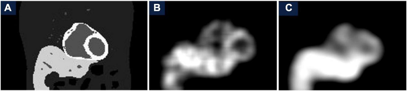 4D XCAT phantom was used to model the torso part of the human body that included cardiac beating and respiratory motion (36). The original phantom model was established from CT data using Non-uniform Rational B-Splines (NURBS). This simplified torso model has up to 20 materials consisting of myocardium and pericardium, blood pool, ventricles, arteries, veins, muscle, gallbladder, lungs, spleen, stomach, rib bone, cortical bone, spine bone, and liver. These materials were categorized into 4 groups: myocardium, blood, liver, and the rest as background. The matrix size of the original phantom was also modified to reduce the simulation time with particular focus on the cardiac and diaphragm motion. The simplified torso phantom was a matrix of 180 × 120 × 110 elements each corresponding to voxels of 2.2 mm × 2.2 mm × 2.2 mm (Figure 1). Attenuation maps for the same phantom were also generated assuming a Tc-99m isotope at an energy of 140 keV.