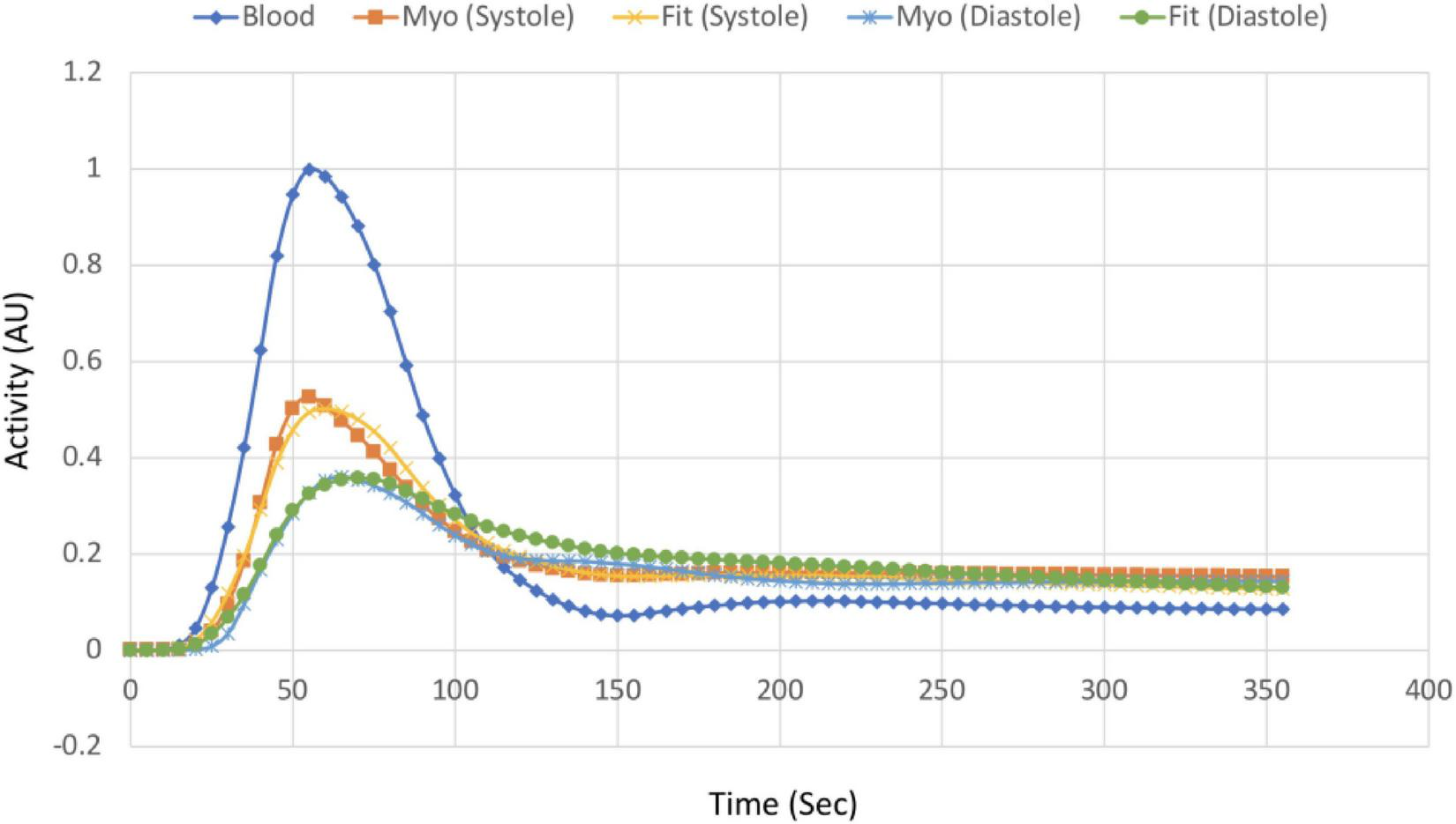The method described in this study is capable of estimating dynamic quantitative indices such as wash-in (K1) and wash-out (k2) rates for each gate. These parameters can be estimated by fitting the TAC of the myocardial tissue activity using a compartment model. The myocardial TACs were fitted using a 1-tissue compartment model (1TCM) with LV blood pool as an input function (12) for Cases 1, 2 and 3. The spillover from LV into the myocardium was also corrected by incorporating the blood fraction (VL) in the model.