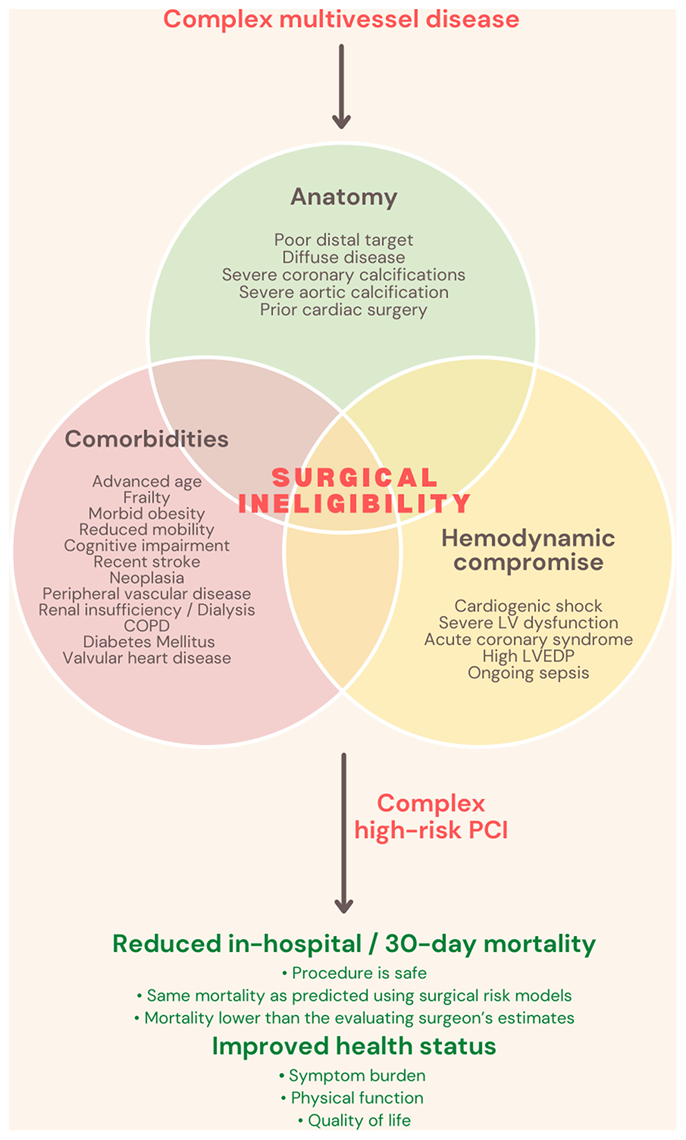 Complex high-risk indicated procedures definition and benefits. COPD, Chronic obstructive pulmonary disease; LV, left ventricle; LVEDP, left ventricular end-diastolic pressure; PCI, Percutaneous coronary intervention.
