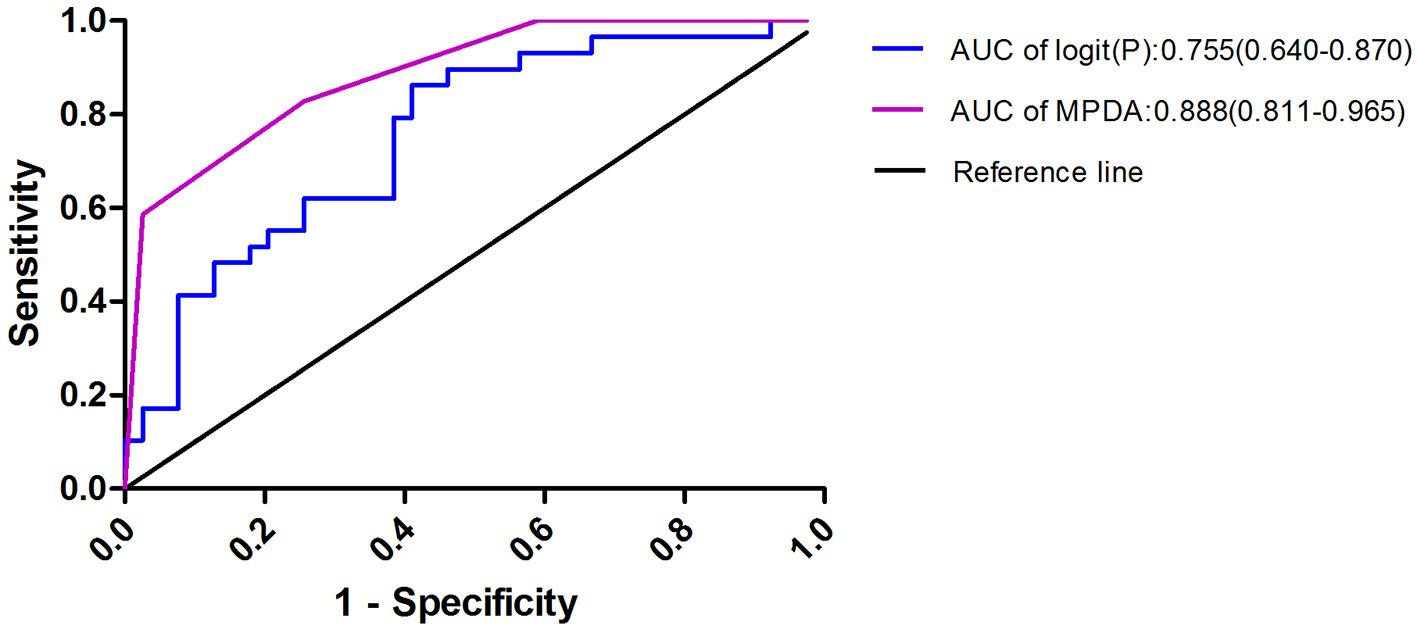 In the APS-PE group, we observed a higher proportion of males (43.6 vs. 20%), a higher proportion of low-risk patients (58.7 vs. 10%), lower levels of white blood cells and platelets (PLT), longer activated partial thromboplastin time (APTT), and a slight increase in D-dimer levels. Patients who were triple positive for antiphospholipid antibodies (aPLs) were younger. The APTT gradually increased as the number of positive aPLs increased. The risk factors for APS included male (OR = 5.565, 95% CI 1.176–26.341), decreased PLT (OR = 0.029, 95% CI 0.003–0.330), slightly increased D-dimer (OR = 0.089, 95% CI 0.019–0.426), and prolonged APTT (OR = 4.870, 95% CI 1.189–19.951). The risk score was named MPDA and included male, PLT, D-dimer and APTT, which can predict APS in PE patients with the AUC at 0.888 (95% CI 0.811–0.965).