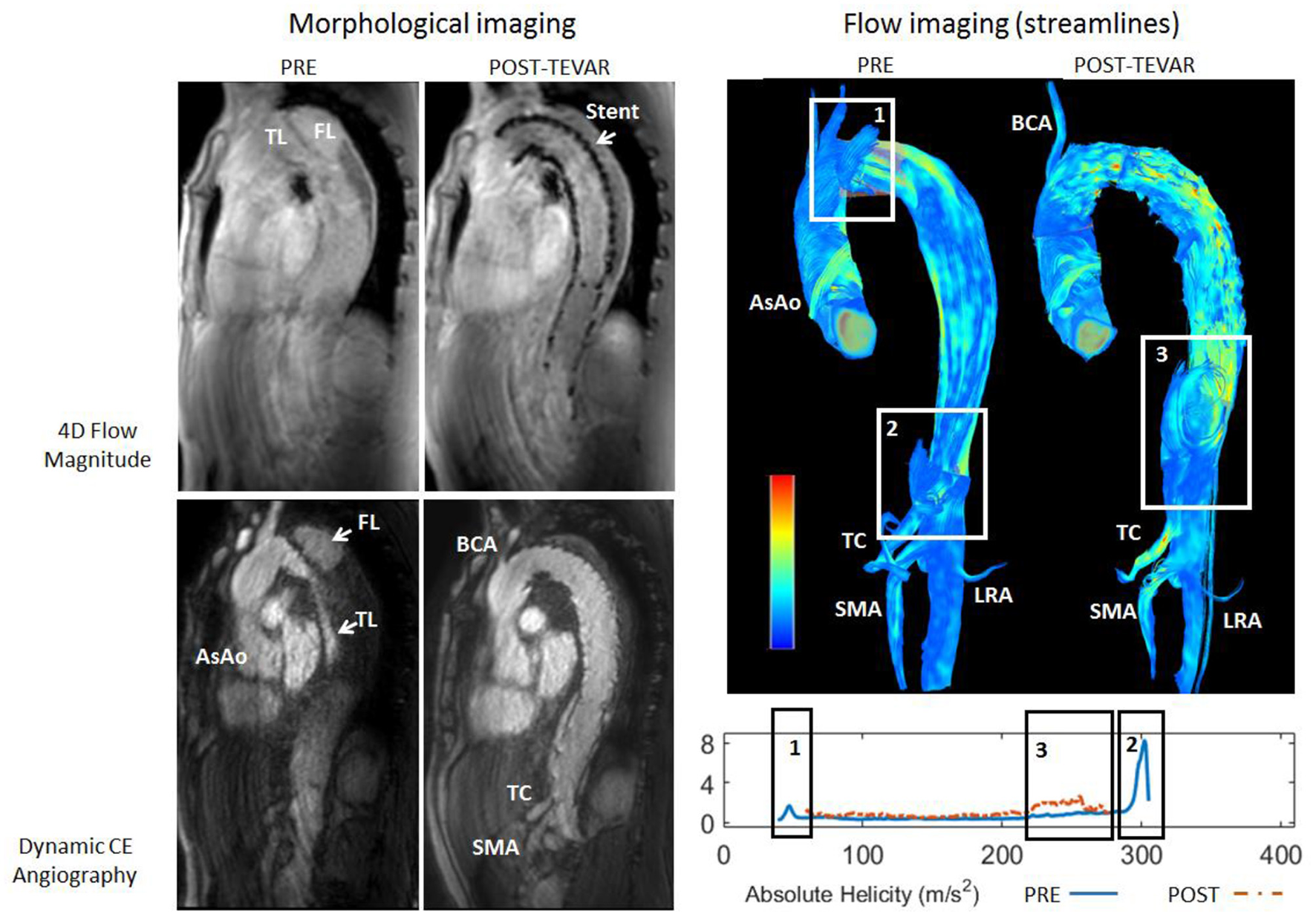 Top: Streamline visualization of the pre-operative and post-operative flow patterns in the aorta of Patient 4. Pre-operatively, presence of helical flow can be observed in the false lumen resulting from the primary entry tear (rectangle 1) and at the ostium of the truncus caeliacus (TC, rectangle 2). Post-operatively, presence of helical flow can be observed in the false lumen downstream of the endo-prosthesis at the diaphragmatic level (rectangle 3). Bottom: Plots of absolute helicity along the false lumen, in agreement with the qualitative observations.