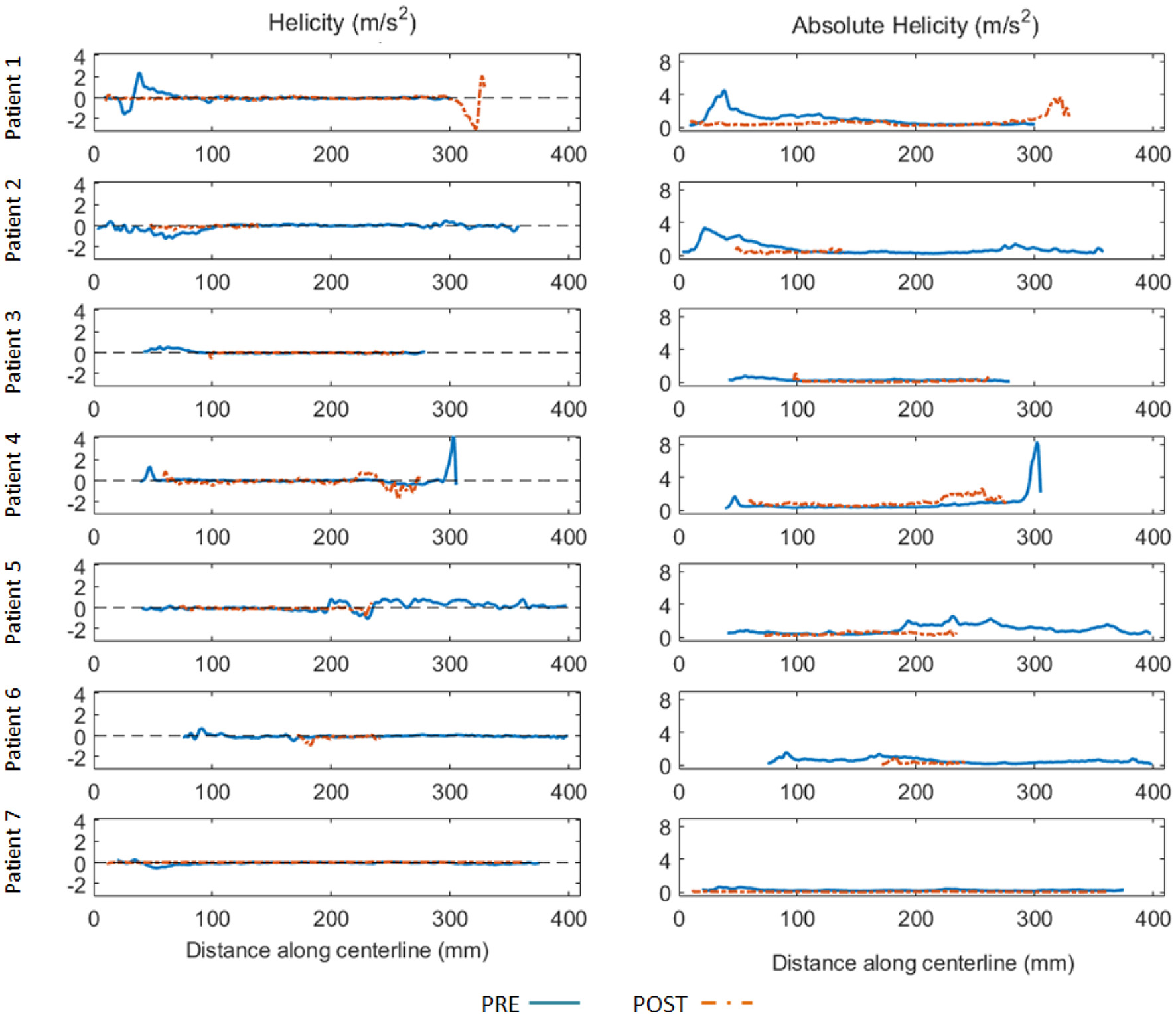 Helicity (left) and absolute helicity (right) plots obtained in the false lumen along the aorta centerline (spaced 1 mm apart) for all patients before (blue full line) and after TEVAR (orange dashed line). Horizontal axis indicates the distance (in mm) along the centerline with respect to the same anatomical reference location (5 cm above the aortic sinus). To be noted the elevated helicity in the proximal part of the false lumen for Patient 1 and Patient 2, indicating significant blood circulation through the entry tears. Elevated helicity was also observed in the distal part of the false lumen, related to one significant re-entry tear at the coeliac truncus (Patient 4) and to several entry tears in a patient with identified Marfan syndrome (Patient 5). Helicity decreased significantly post TEVAR in the proximal part of the false lumen for all patients. Oppositely, helicity increased in the distal part for 2 patients (Patient 1 and 4).
