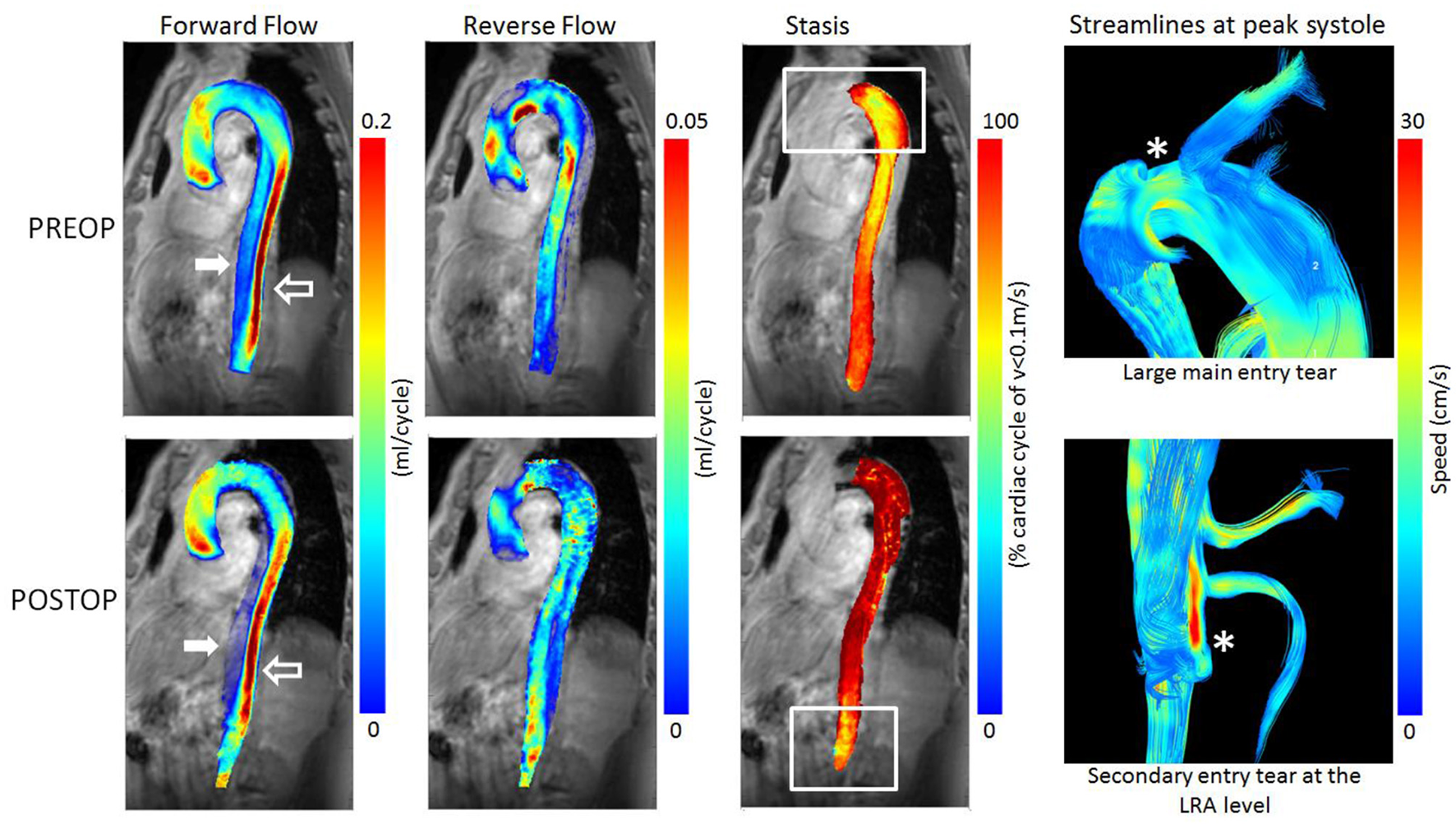 Pre-operative (TOP) and post-operative (BOTTOM) parametric hemodynamic maps of Patient 1 presenting with persistent pain as indication for TEVAR. Forward and Reverse flow maps (Left) are presented for both the true lumen (empty arrow) and the false lumen (white arrow). Forward flow increased in the true lumen and significantly decreased in the false lumen post-TEVAR. Similarly, reverse flow increased in the true lumen and decreased in the false. Reverse flow can also be observed in the ascending aorta indicating a recirculation region, both pre and post-op. To be noted, the local high reverse flow at the LRA level post-TEVAR that may indicate a hemodynamically significant secondary tear. Stasis maps (Center) are presented for the false lumen only to avoid confusion from the true lumen, as the false lumen twirls around it. Significant increase in stasis is observed post-TEVAR, except for the lower most region. Importantly, stasis maps facilitated visualization of hemodynamically significant entry tears (*), as confirmed by the streamline visualization (Right).