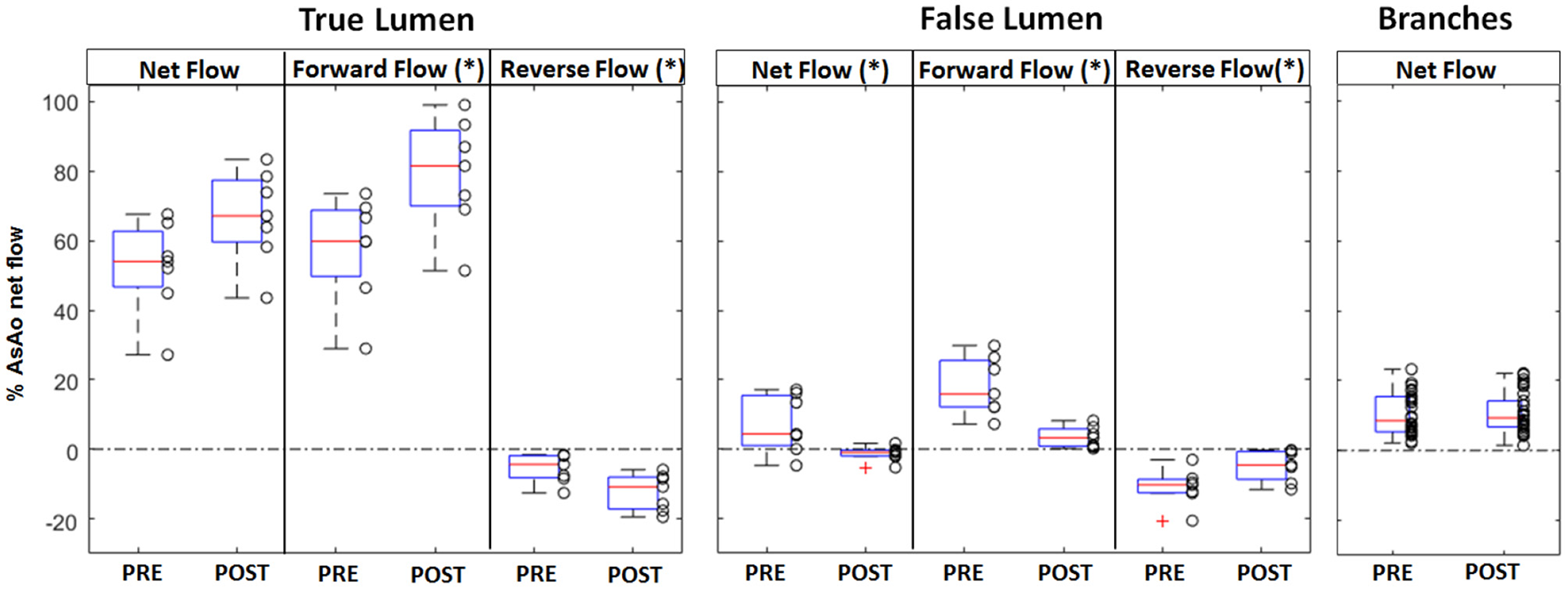 Box plot representation of the net, forward, and reverse flows in the true and the false lumen, and the net flow in the aortic branches, measured pre and post-intervention. The box plot shows the first and third quartiles, the red line shows the median, and the whiskers show the minimum and respectively maximum value; outliers are shown as red crosses. For the aorta, each value represents the average flow along the vessel centerline between the left subclavian artery and the celiac trunk and is normalized to the net flow of the ascending aorta. Significantly different flow values were obtained post-operatively in the false lumen for net, forward, and reverse flow, and in the true lumen for forward and reverse flow (* indicates p < 0.05).