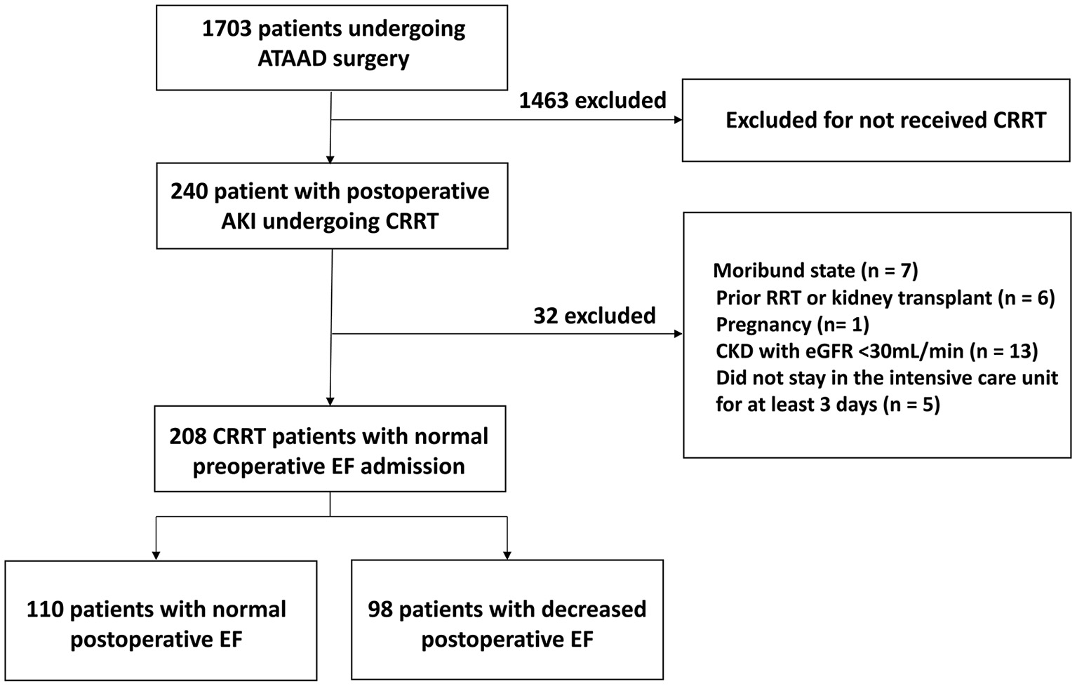 This study was a retrospective analysis. ATAAD patients from Beijing Anzhen Hospital with normal preoperative EF and postoperative CRRT for AKI, admitted between January 2014 and November 2021 were included in this study. Inclusion criteria were as follows: (1) patients' age ≥18 years old; (2) patients who underwent ATAAD surgery with moderate hypothermic circulatory arrest; (3) patients who underwent CRRT due to postoperative AKI; (4) preoperative echocardiography revealing normal EF (EF ≥50%); (5) patients who needed hospitalization in intensive care unit (ICU) for at least 3 days. Exclusion criteria were as follows: (1) abnormal EF revealed by preoperative echocardiography (EF <50%); (2) patients with a history of undergoing renal replacement therapy (RRT); (3) pregnant women; (4) moribund patients with expected death within 24 h; (5) patients with a history of chronic renal insufficiency (meeting any of the following criteria for more than 3 months: proteinuria ≥30 mg/24 h; albumin-to-creatinine ratio ≥3 mmol; abnormal urinalysis routine; electrolyte disorders caused by acute tubular necrosis; abnormal renal pathology; abnormal renal imaging; renal transplantation; estimated glomerular filtration rate [eGFR] <30 mL/min). This study was approved by the Institutional Ethics Committee of the Beijing Anzhen Hospital Affiliated to Capital Medical University.