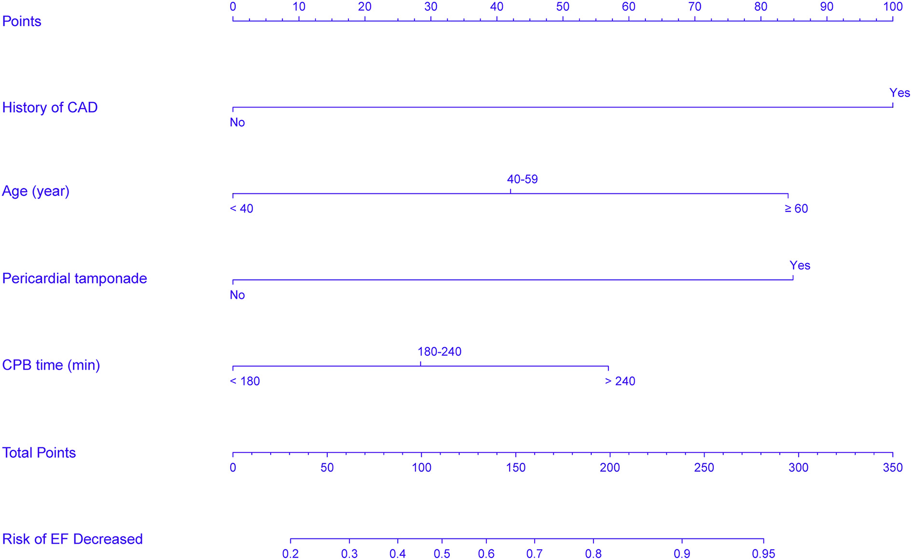 In total, 208 patients were eligible for analysis, of which 98 patients with reduced cardiac function. The logistic regression analyses showed age ≥60 years old, history of coronary atherosclerotic disease, preoperative pericardial tamponade, and cardiopulmonary bypass time were risk factors for reduced cardiac function, which were further employed in the nomogram. As results, nomogram revealed a high predictive power (C statistic = 0.723, 0.654–0.792; the bootstrap-corrected concordance C statistic = 0.711, the area under the ROC curve = 0.723). The calibration curves showed good consistency between the predicted and the actual probabilities (calibration curve: Brier points = 0.208, Emax = 0.103, Eavg = 0.021; Hosmer-Lemeshow test, P = 0.476). DCA showed that the nomogram could augment net benefits and exhibited a wide range of threshold probabilities in the prediction of EF reduction.