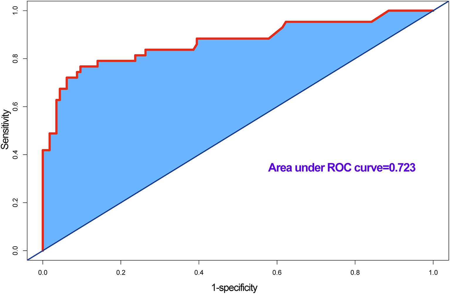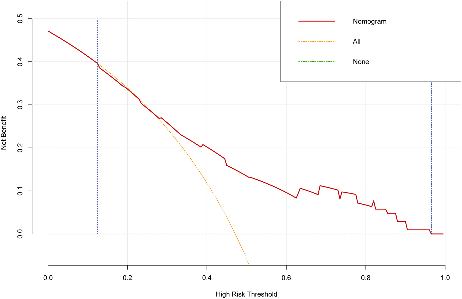 The performance of the nomogram was evaluated by discrimination and calibration. The discriminative ability of the model was reflected by the area under the receiver operating characteristic (ROC) curve, which is equal to the concordance statistic. Calibration was performed by a visual calibration plot, which was described through brier points, Emax, Eavg, etc. (15) An insignificant Hosmer-Lemeshow test also indicated a good calibration (P > 0.05). Decision curve analysis (DCA) was established to evaluate the clinical benefit of the nomogram by quantifying the net benefits along with the increase of threshold probabilities. The statistical analysis and graphics were performed with R 4.1.2 software. All tests were 2-tailed, and P <0.05 was considered statistically significant.