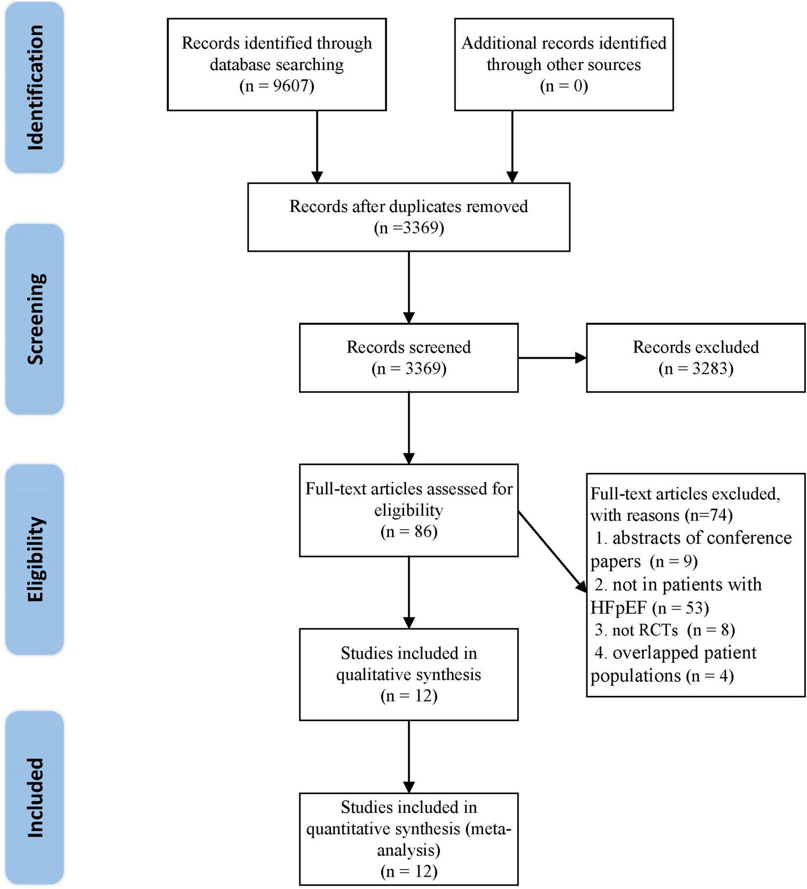 A total of 9,607 articles were retrieved from the initial search. After deleting the duplicate literature, 3,369 articles remained. After reading the title and abstract, 3,283 articles were excluded, and 86 articles were screened in detail. By reading the full text of the remaining 86 articles, 74 articles were excluded (Supplementary Table 1), which did not meet our inclusion criteria: eight were not RCTs; nine were abstracts of conference papers; 53 were not in patients with HFpEF; four were overlapped patient populations. Finally, 12 trials (29, 30, 39–48) were qualified and included in the meta-analysis. The flow chart of literature screening is as follows (Figure 1).