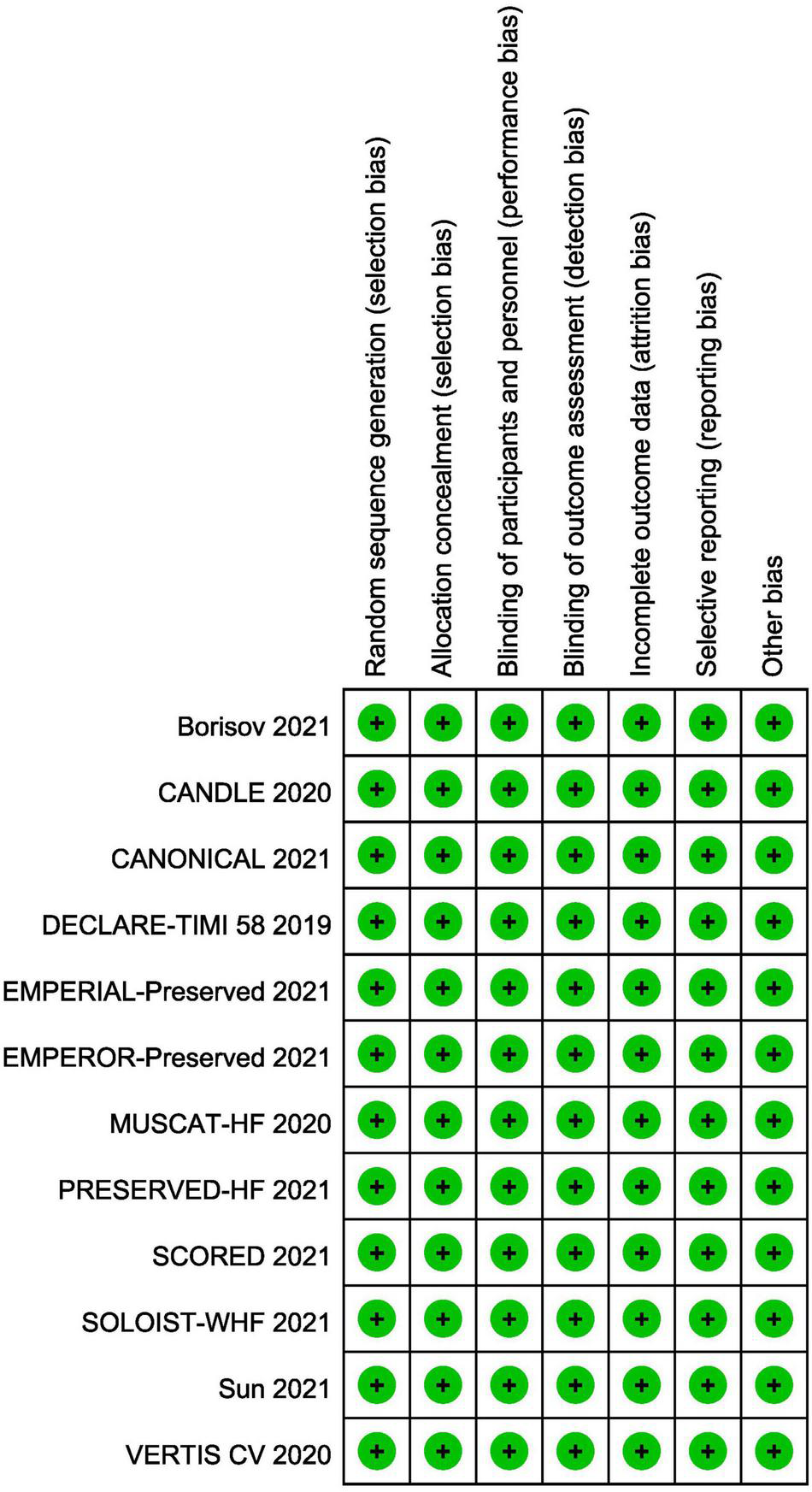 MEDLINE, EMBASE, Ovid, Cochrane Library, Chinese National Knowledge Infrastructure Database, VIP database, Chinese Biomedical Database, and Wanfang Database were searched from inception to November 2021 for randomized controlled trials (RCTs) of SGLT2 inhibitors for HFpEF. Risk bias was assessed for included studies according to Cochrane handbook. The primary outcome was the composite of first hospitalization for heart failure (HHF) or cardiovascular mortality. First HHF, cardiovascular mortality, total HHF, all-cause mortality, exercise capacity, ventricular diastolic function, and adverse events were considered as secondary endpoints. PROSPERO registration: CRD42021291122.