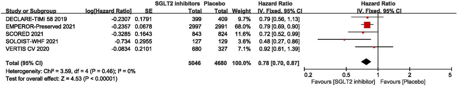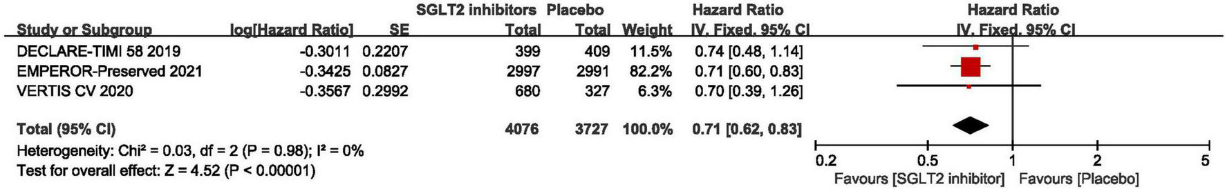 The result of the Meta-analysis of three studies (29, 30, 44) demonstrated that SGLT2 inhibitors significantly reduced the number of first hospitalization for heart failure in patients with HFpEF compared to placebo (HR: 0.71, 95% CI: [0.62, 0.83], P < 0.00001, I2 = 0%). The result is shown in Figure 6.