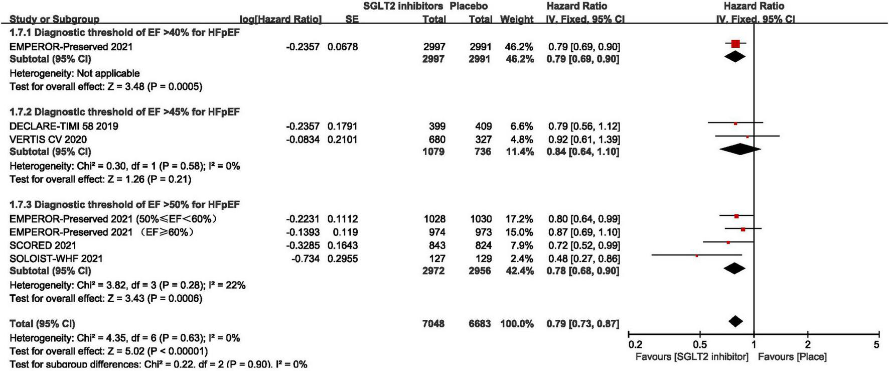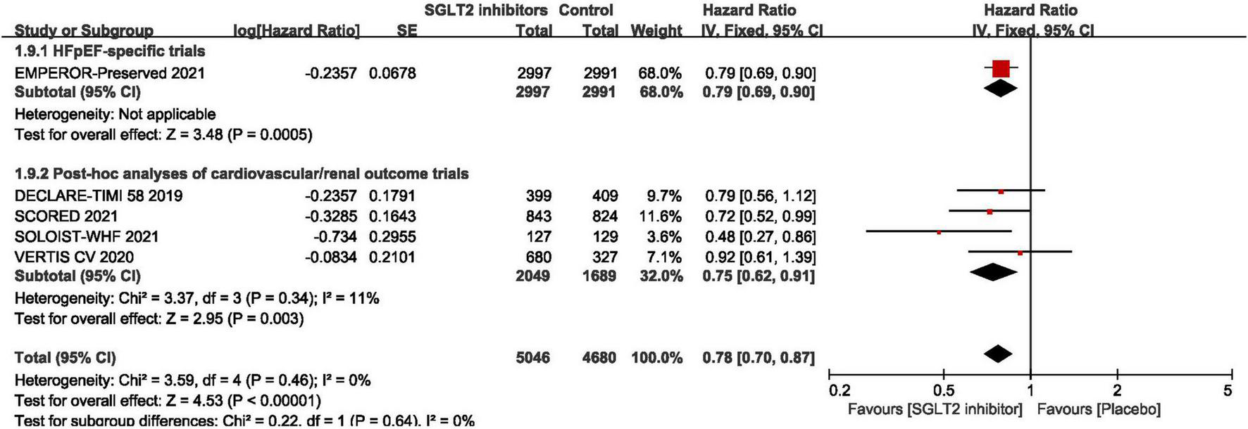 As shown in Figure 3, pooled result of the 5 trials (29, 30, 43–45) revealed that SGLT2 inhibitors significantly reduced the composite of first hospitalization for heart failure or cardiovascular death compared to placebo in patients with HFpEF (HR:0.78, 95% CI: [0.70, 0.87], P<0.00001, I2 = 0%). According to various thresholds of left ventricular ejection fraction (40, 45, or 50%) used in the diagnosis of HFpEF, the subgroup analysis revealed that when using a left ventricular ejection fraction > 50% as the cut-off point for HFpEF, SGLT2 inhibitors also significantly reduced the composite endpoint of the first hospitalization for heart failure or cardiovascular death in patients with HFpEF (HR: 0.78, 95% CI: [0.68, 0.90], P = 0.0006, I2 = 22%) (as shown in Figure 4). In the 5 trials, one trials was HFpEF-specific trial and four were post hoc analyses of cardiovascular/renal outcome studies. The findings of the HFpEF-specific trials (HR: 0.79, 95% CI: [0.69, 0.90], P = 0.0005) and the post hoc studies (HR: 0.75, 95% CI: [0.62, 0.91], P = 0.003, I2 = 11%) were consistent (as shown in Figure 5).