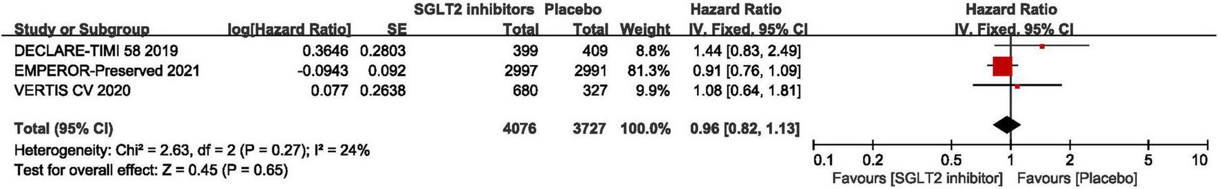 As shown in Figure 7, the pooled result of three RCTs (29, 30, 44) revealed that there was no significant difference between SGLT2 inhibitors and placebo in terms of cardiovascular death (HR: 0.96, 95% CI: [0.82, 1.13], P = 0.65, I2 = 24%).