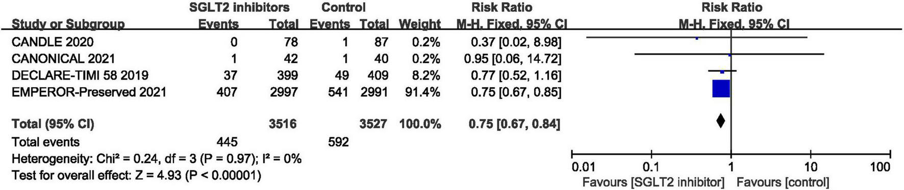 In terms of the total hospitalization for heart failure, which included first and recurrent number of hospitalization for heart failure, the result of meta-analysis of four studies (30, 42, 44, 46) demonstrated that SGLT2 inhibitors significantly reduced the total hospitalization for heart failure in patients with HFpEF compared to placebo (RR:0.75, 95% CI: [0.67, 0.84], P<0.00001, I2 = 0%). The result is shown in Figure 8.