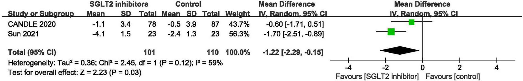 The ratio of early mitral inflow velocity to mitral annular early diastolic velocity was expressed in mean and standard deviation in two trials (46, 48). Pooled result demonstrated that SGLT2 inhibitors significantly reduced the E/e’ in patients with HFpEF compared to control (MD: –1.22, 95% CI: [–2.29, –0.15], P = 0.03, I2 = 59%). The result is shown in Figure 10.