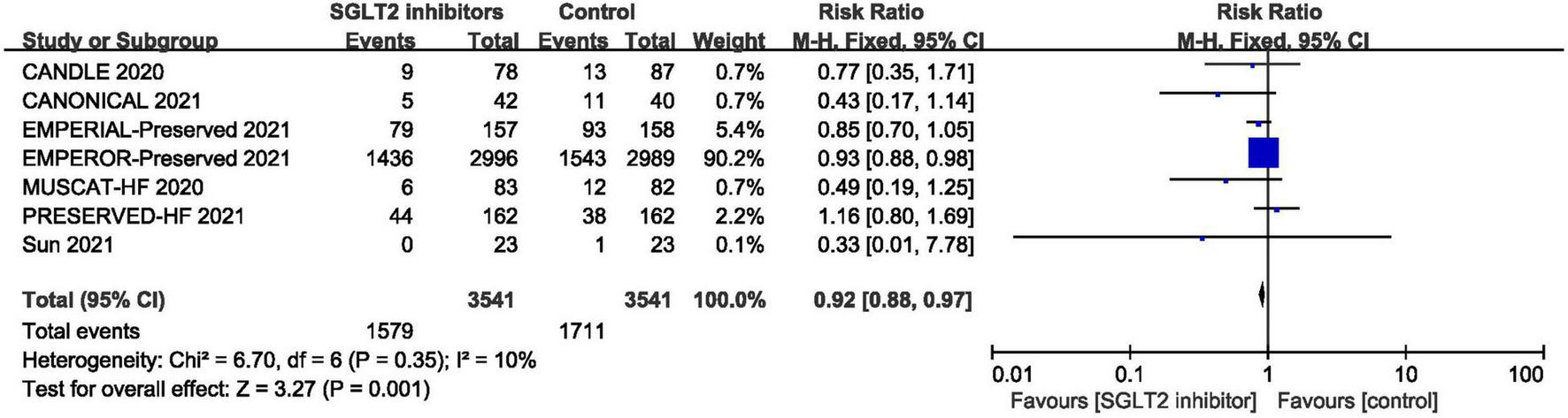 Zhou H, Peng W, Li F, Wang Y, Wang B, Ding Y, Lin Q, Zhao Y, Pan G and Wang X (2022) Effect of Sodium-Glucose Cotransporter 2 Inhibitors for Heart Failure With Preserved Ejection Fraction: A Systematic Review and Meta-Analysis of Randomized Clinical Trials. Front. Cardiovasc. Med. 9:875327. doi: 10.3389/fcvm.2022.875327