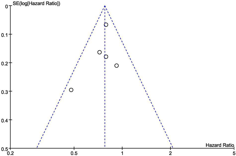 Five RCTs provided data for all-cause mortality (29, 30, 41, 44, 46) and pooled result shown that no statistical difference was found between SGLT2 inhibitors and placebo in terms of the all-cause mortality (RR: 0.99, 95% CI: [0.88, 1.11], P = 0.86, I2 = 0%). The result is shown in Figure 9.