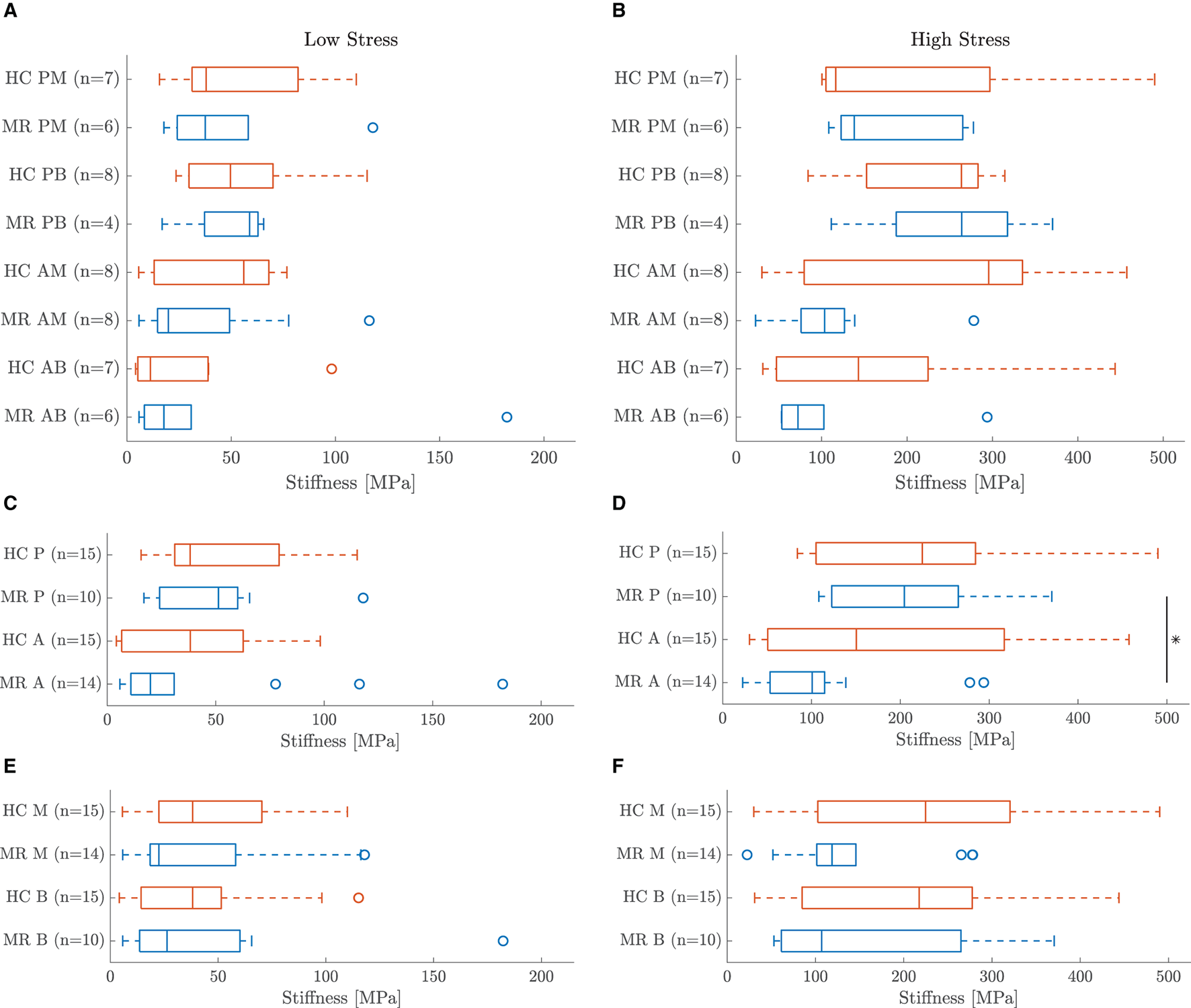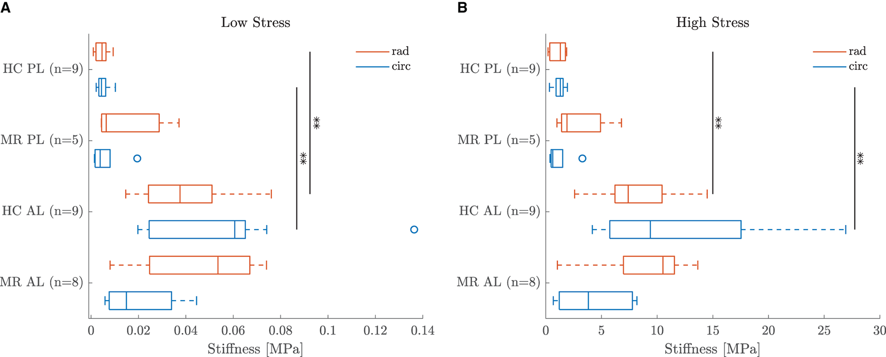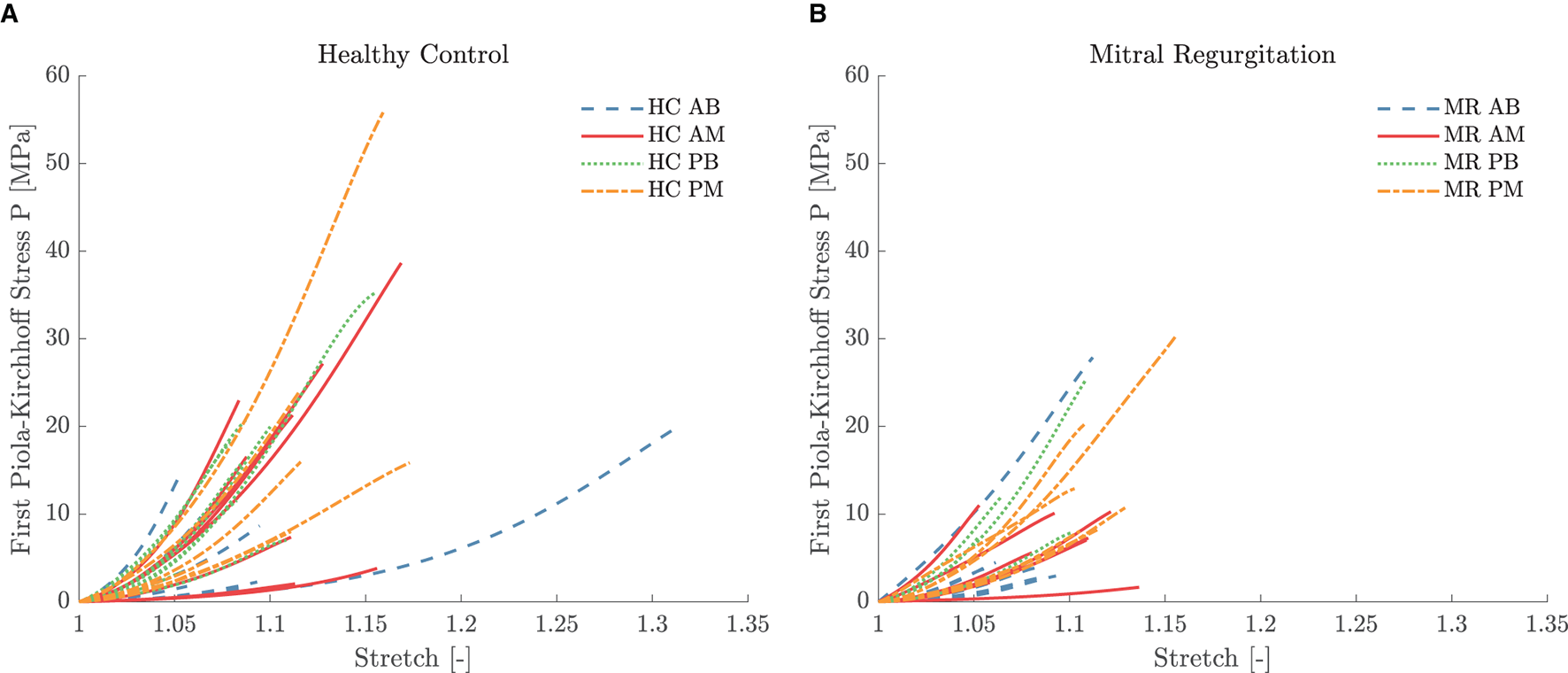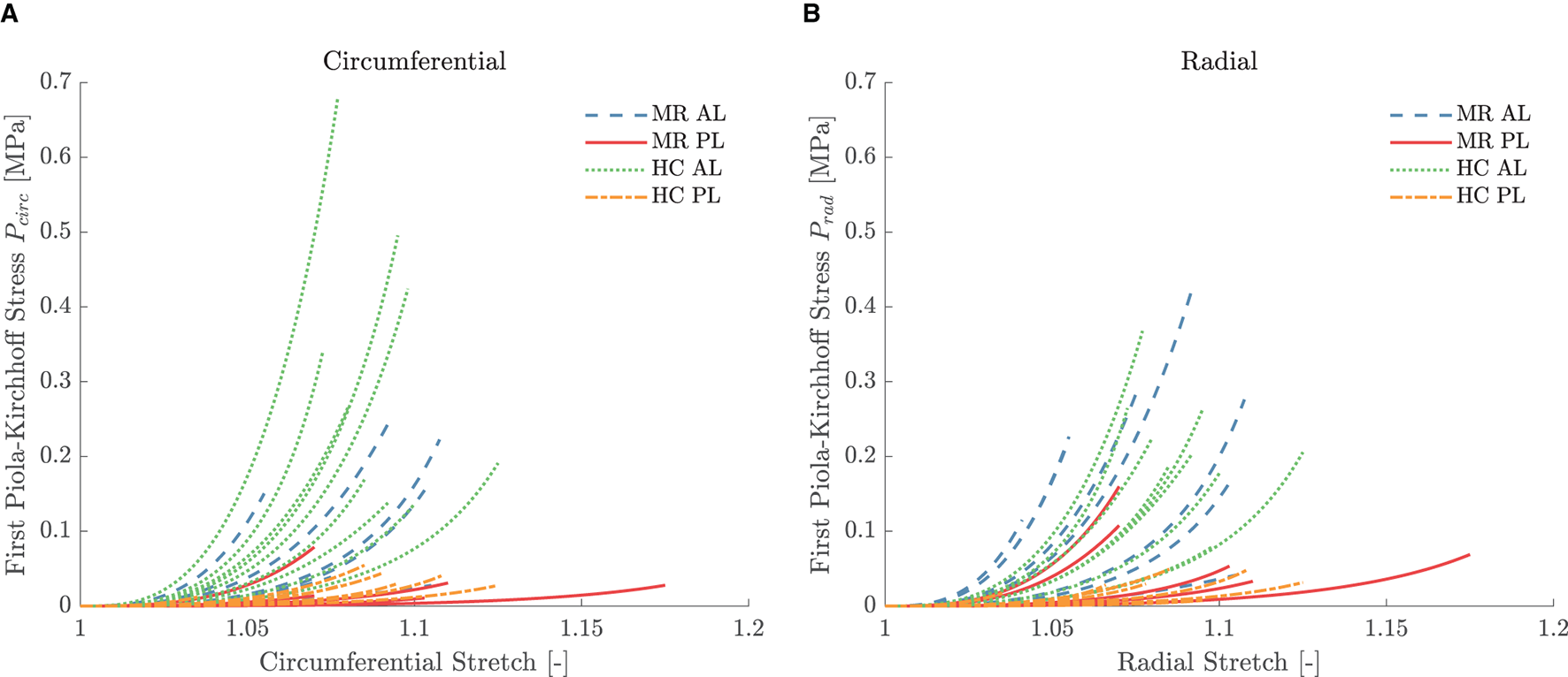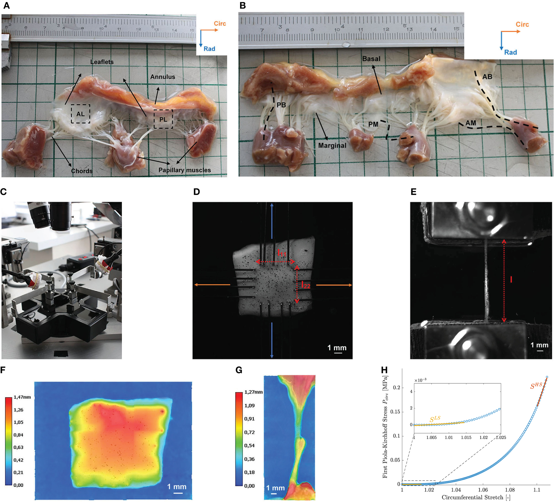 Linearized stiffness moduli were calculated as slope of the first Piola-Kirchhoff model stress as a function of stretch. Stress-stretch curves were generated in the experimental stress range based on the calibrated material parameters and an equibiaxial deformation gradient. The slopes of the stress-stretch curves of the chords at low (LS) and high stress (HS) were determined by fitting the first and last 21 data points with a first order polynomial. As shown in Figure 1H, only 11 data points were used to calculate the slope at high stress for the mitral valve leaflets due to the high nonlinearity of the MN model. To investigate the anisotropy of the mitral valve leaflets, an anisotropy index (AI) was defined as the ratio of the stiffness in circumferential and stiffness in radial direction for both low and high stress. All data processing was performed in Matlab2019b.