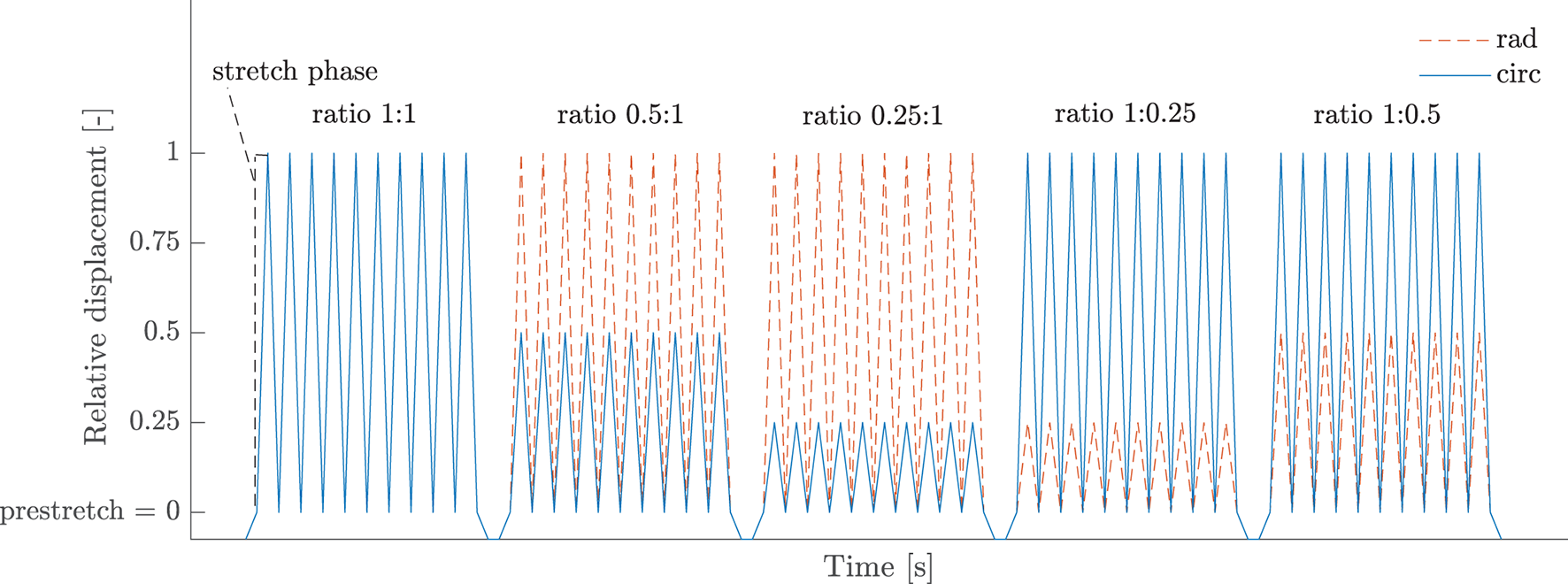 Displacement-controlled protocol of a biaxial test. This part consists of five loading ratios with each ten preconditioning cycles and is repeated for several strain levels. The relative displacement in both circumferential and radial direction is defined with respect to the position at which preload has been reached and is given as a fraction of the imposed strain level.
