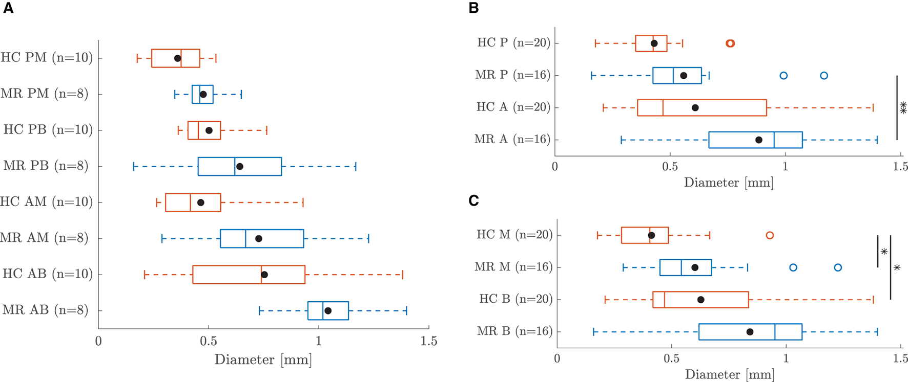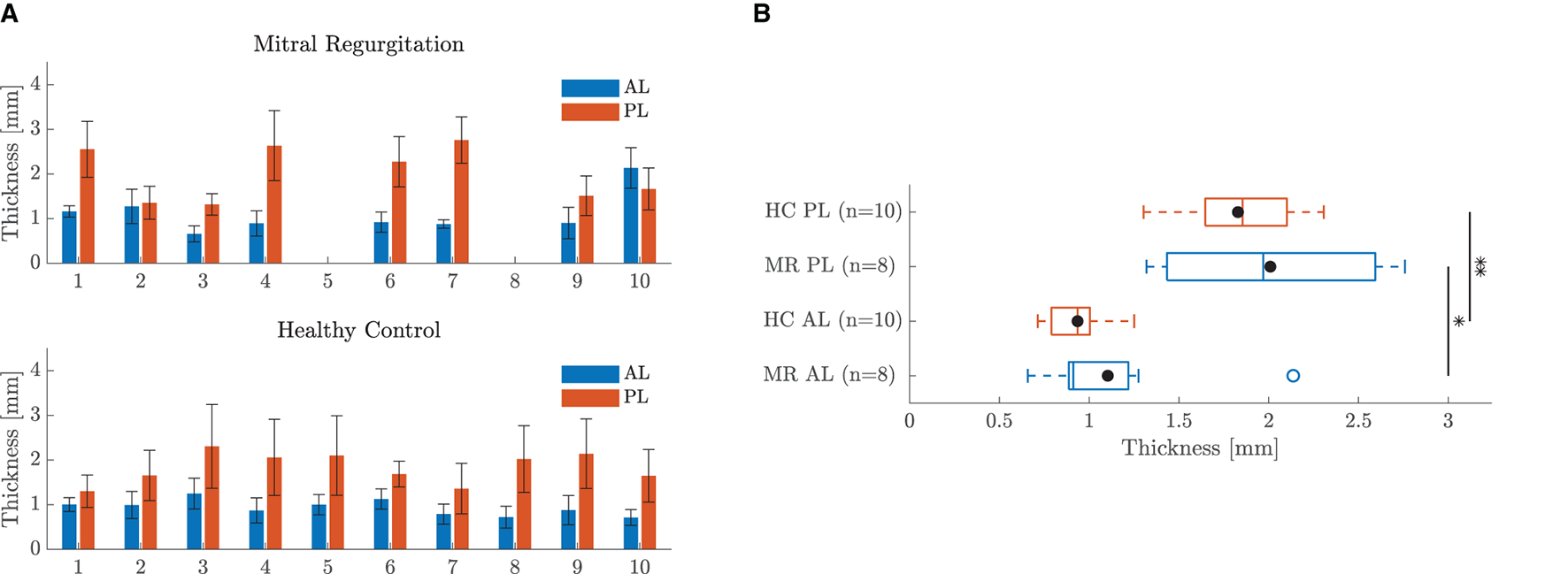 The thickness of each leaflet sample is shown in Figure 3A. Data are represented as mean ± standard deviation of the height map obtained by the Keyence microscope. The standard deviation is a measure of the heterogeneity of the sample. The average sample thicknesses are also visualized in the boxplots of Figure 3B for each leaflet group. The diameters of the different chord samples are shown in Figure 4A for each chordal type and were further grouped per leaflet type in Figure 4B and per insertion region in Figure 4C. Data were checked for normality prior to testing. All data groups were normally distributed with the exception of the HC basal chord samples. Due to the large sample size of this group (n = 20), normal distribution was assumed and a two-sample t-test was performed for each category. The mean value and standard deviation of the leaflet thickness and chord diameter per group are given in Supplementary Tables 1, 4, respectively.