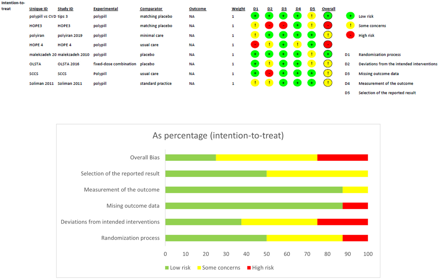 Four hundred and fifty five publications were extracted from literature search and, after the removal of duplicates, 361 moved on to the next stage of review. After title and abstract screening, 18 studies were eligible for a full-text review. Of these, eight studies were eligible for inclusion in our meta-analysis. A detailed description is illustrated in the PRISMA flow chart (Figure 1). Of the eight trials included, six contained data that compared the incidence of fatal and non-fatal cardiovascular events – such as stroke, myocardial infarction, heart failure, cardiovascular death, and revascularisation – between patients who received a polypill treatment and those who received placebos/minimal pharmacological care. Two studies did not contain information about CV events, so we instead compared the mean difference in the 10-year predicted cardiovascular risk between patients who received the polypill and patients who received placebos/minimal care. We were able to extract this outcome from a third study as well, so its results were included along with the other two in the Meta-Analysis. The summary and the risk of bias of the included studies are shown in Table 1 and Figure 2, respectively. The quality of evidence table is presented in Table 2.