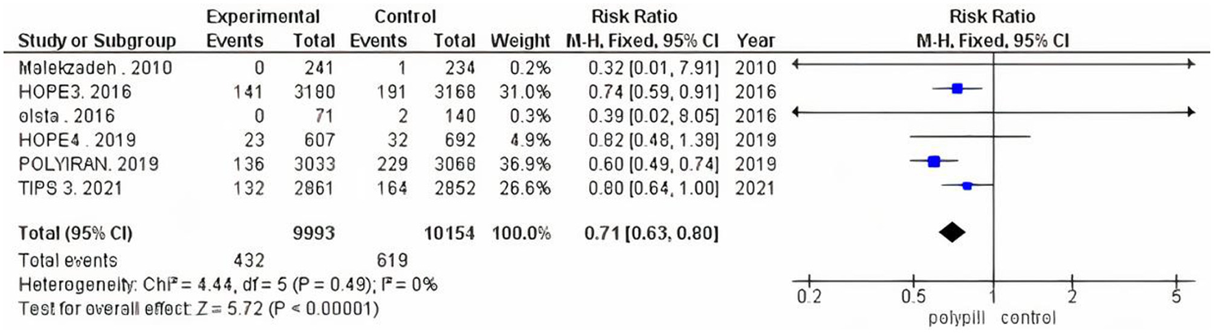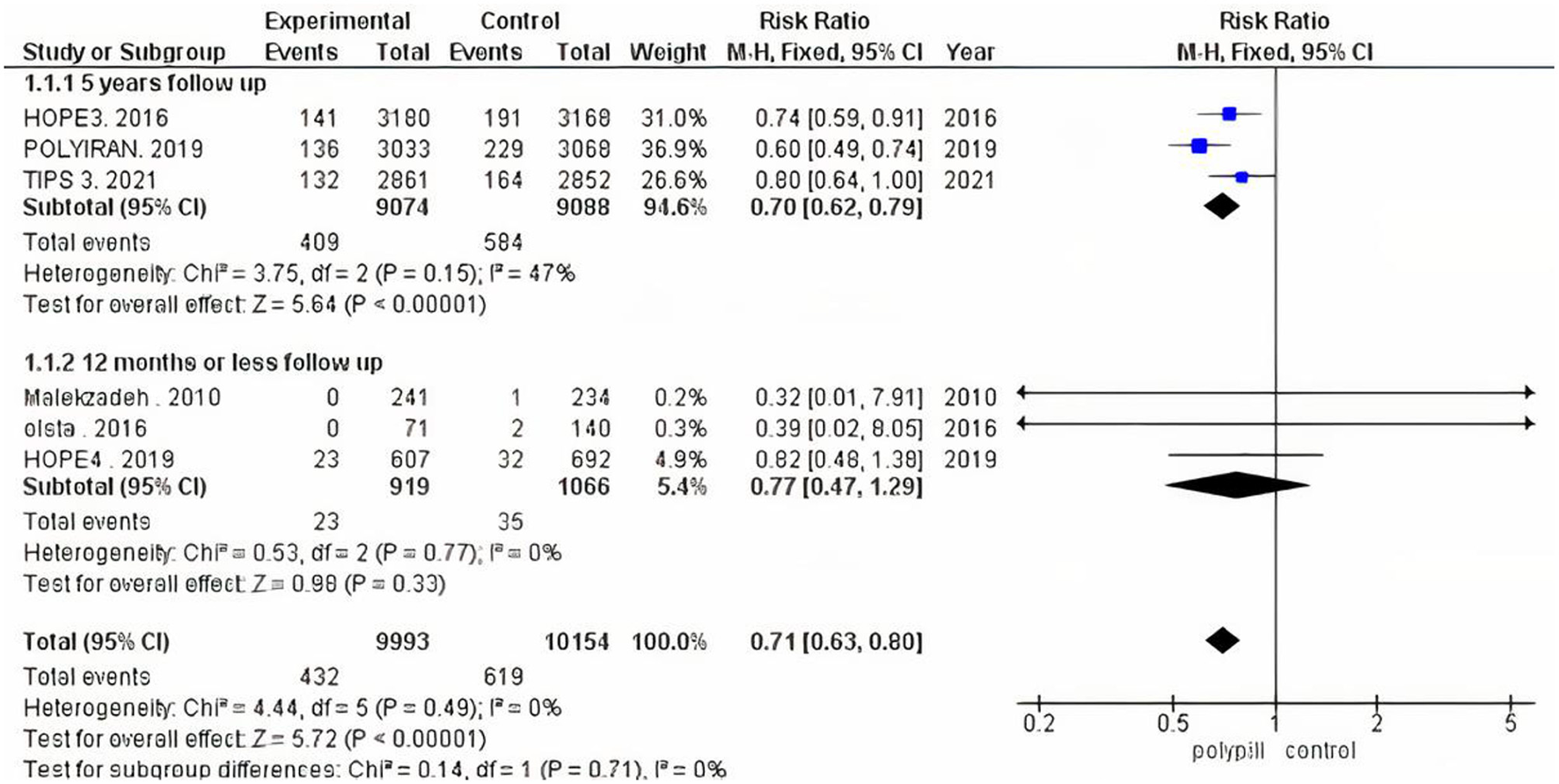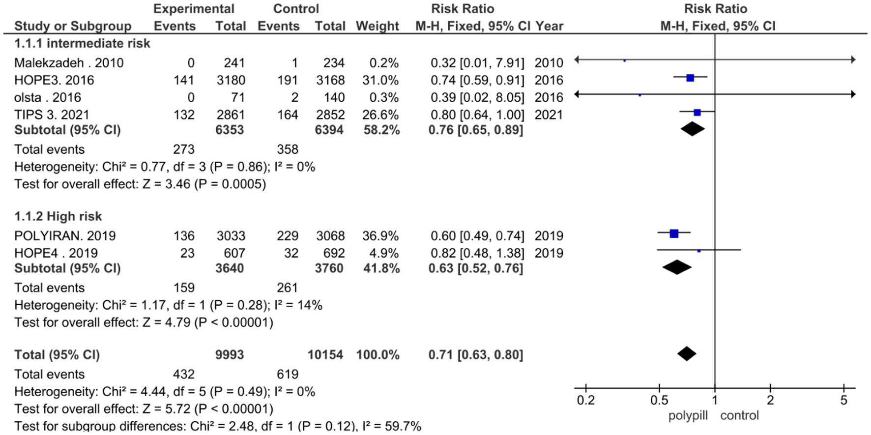 Eight trials with a total of 20653 patients were included. There was a significant reduction in the total number of fatal and non-fatal CV events among the polypill group [RR (95% CI) = 0.71 (0.63, 0.80); P-value < 0.001]. This reduction was observed in both the intermediate-risk [RR (95% CI) = 0.76 (0.65, 0.89); P-value < 0.001] and high-risk [RR (95% CI) = 0.63 (0.52, 0.76); P-value < 0.001] groups of patients. Subgroup analysis was performed based on the follow-up duration of each study, and benefits were only evident in the five-year follow-up duration group [RR (95% CI) = 0.70 (0.62, 0.79); P-value < 0.001]. Benefits were absent in the one-year-or-less interval group [RR (95% CI) = 0.77 (0.47, 1.29); P-value = 0.330]. Additionally, there was a significant reduction in the 10-year predicted cardiovascular risk in the polypill group [MD (95% CI) = −3.74 (−5.96, −1.51); P-value < 0.001], as compared to controls.
