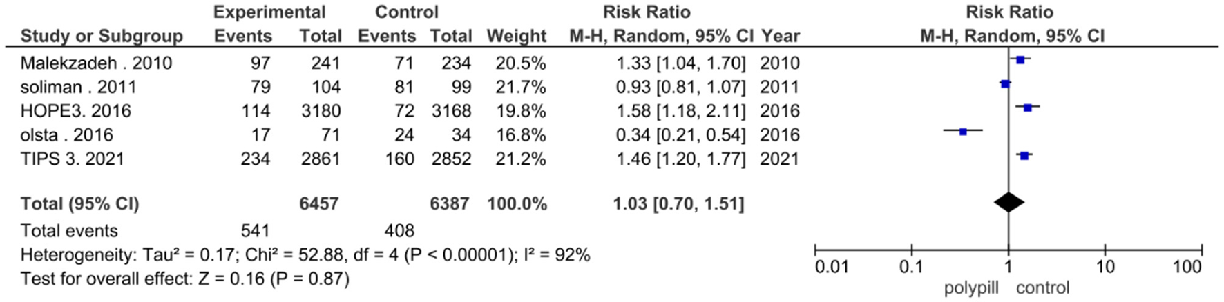 Our meta-analysis suggests that a polypill regimen for primary prevention in patients with intermediate- to high- cardiovascular risk reduces the incidence of fatal and non-fatal cardiovascular outcomes, including death from cardiovascular causes, myocardial infarction, stroke, heart failure, resuscitated cardiac arrest, arterial revascularization, and angina. Eight studies met inclusion criteria, wherein the pooled outcomes of 10,240 patients receiving a polypill were compared with 10,413 patients who did not receive a polypill. Previous studies revealed that the effect of the polypill on fatal and non-fatal ASCVD events was uncertain (8). This may have been due to low-quality evidence, since previous trials had a short duration and were not designed to assess the clinical outcome of the polypill (rather, the data used in analysis were mainly reported as adverse events). The previous trials had several disadvantages that were overcome in the trials included in our meta-analysis, and results could not be generalized because they were restricted to low income and non-developed countries. In our analysis, the HOPE 3 study included 21 countries throughout the world, such as the United States, Australia, and multiple countries in Europe. The TIPS 3 study also included patients from North America. Another major pitfall of previous trials was that they often reported the effect of the polypill on the CV risks themselves, such as blood pressure and blood lipid levels, rather than clinical outcomes. Again, this issue was resolved in our meta-analysis by several trials that were specifically designed to assess the effect of the polypill on a composite of CV deaths, MI, stroke, and revascularisation. In these studies, such as TIPS 3, HOPE 3, and PolyIran, we witnessed a pooled risk ratio between the polypill and comparator groups of 0.70 (95% CI 0.62 to 0.79, p-value > 0.00001). In studies that did not report these outcomes, we instead analyzed the 10-year predicted cardiovascular risk – for example, the SCCS and Soliman trials showed a significant −3.74 (95% CI −5.96 to −1.51, p-value = 0.001) mean difference between treatment and minimal care/placebo groups.