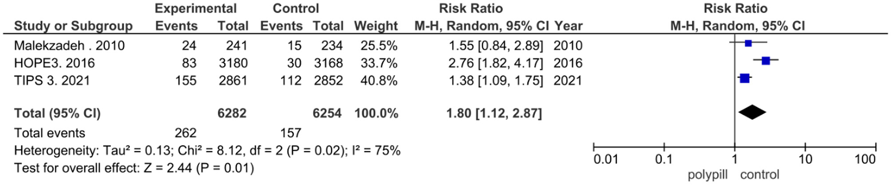 The primary outcome was the effect of Polypill on total fatal and non-fatal cardiovascular events as Myocardial infarction, stroke, heart failure or angina. Secondary outcomes were effect of polypill on the predicted 10-year cardiovascular risk for the studies which lacked data regarding our primary outcome, so the mean difference of the cardiovascular risk score was used as a predictor of these fatal and non-fatal CV events. The number of participants who discontinued treatment due to adverse effects and the total adverse events along with myalgia were also analyzed.