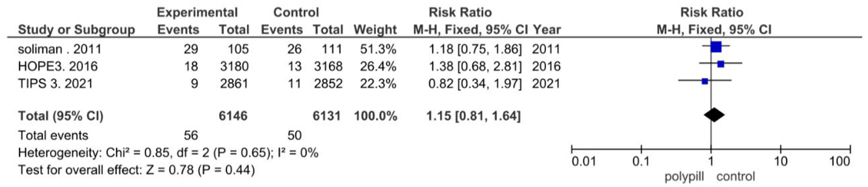 In the included clinical trials, myalgia was found to be the most reported adverse event. Three of the eight trials in our meta-analysis reported myalgia. Of the 6,146 patients in the polypill group of these three trials, myalgia was reported in 56 patients; of the 6,131 patients in the minimal care/placebo group, myalgia was reported in 50 patients. The pooled risk ratio of myalgia between patients who received the polypill treatment and patients who received minimal care/placebo was 1.15 (95% CI 0.81 to 1.64, p-value = 0.44). We found no statistically significant heterogeneity among the three trials (p = 0.65), as shown in Figure 9.