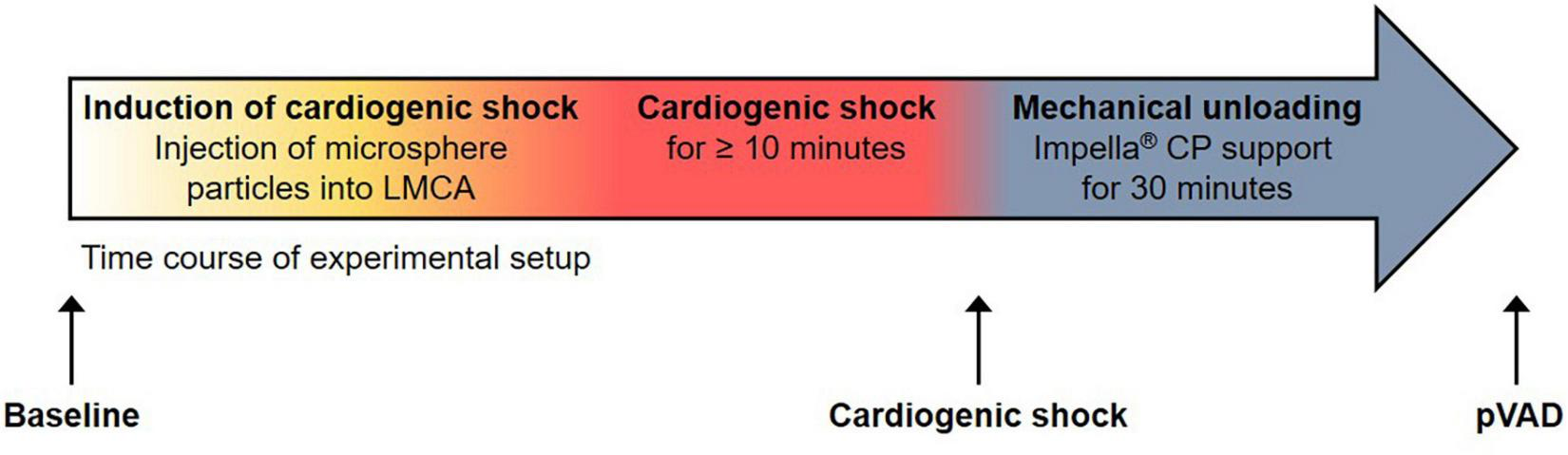Experimental setup. Time course of experimental setup with induction of cardiogenic shock and percutaneous ventricular assist device (pVAD) support by Impella ® CP. Serum samples were collected at the time points denoted by black arrows. Note that the time point “pVAD” refers to pVAD support in the presence of cardiogenic shock.