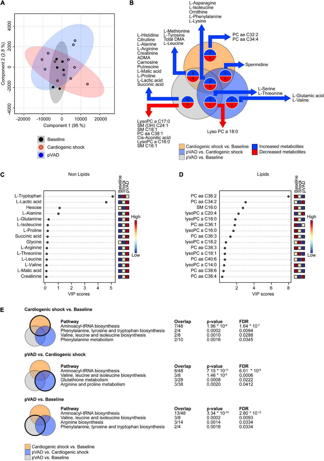 Metabolomic profiling of serum. (A) Partial Least Squares-Discriminant Analysis (PLS-DA) visualizing global metabolite abundance. (B) Venn diagram illustrating the number of altered metabolites as determined by LC-MS and GC-MS metabolomic analysis. Numbers of metabolites presented in the Venn diagram correspond to p < 0.05. (C,D) Variable importance in projection (VIP) score analyses. (E) Significantly enriched pathways for the comparisons as indicated (cut-off: false discovery rate (FDR) p < 0.05); pVAD, percutaneous ventricular assist device.