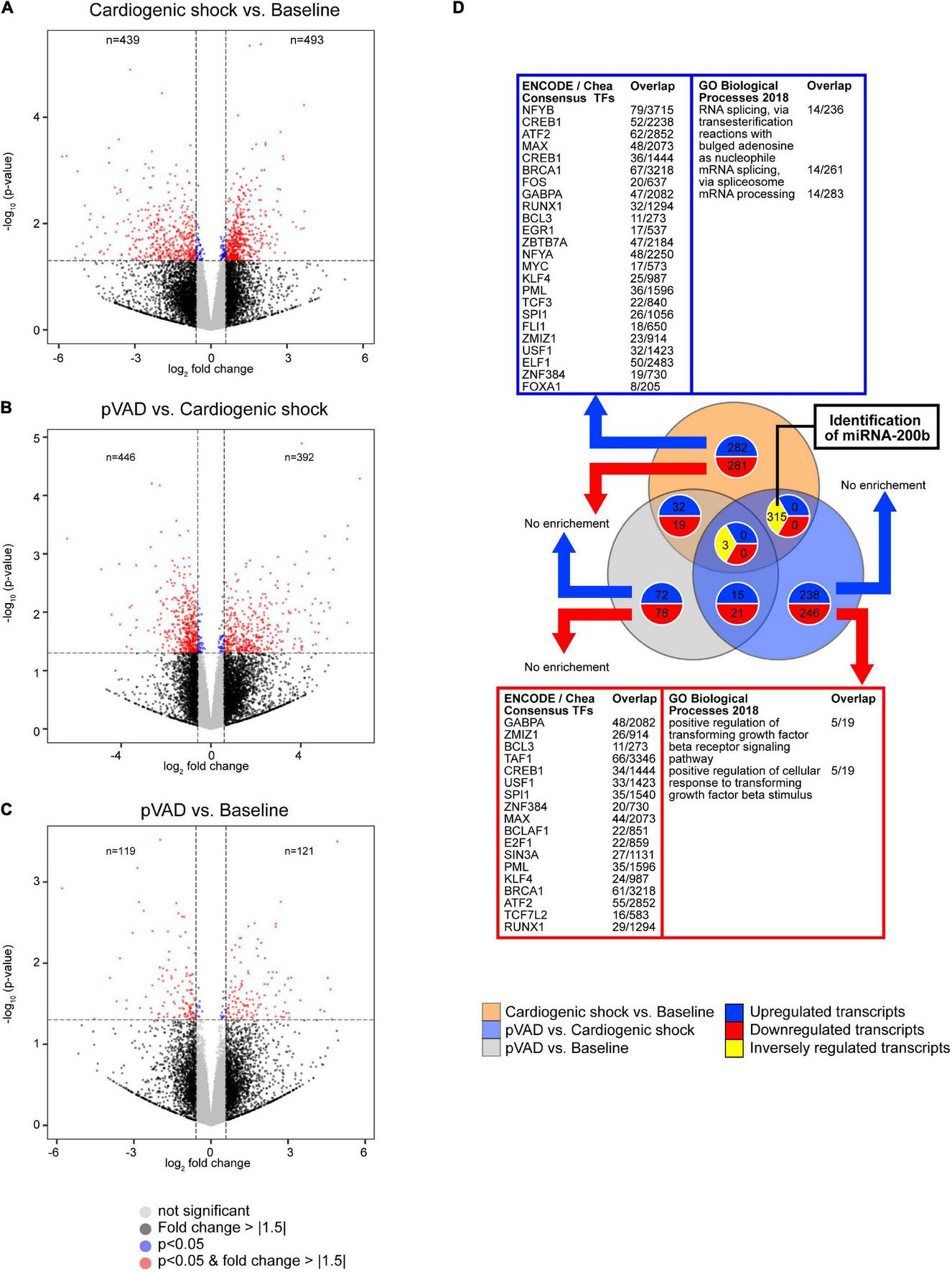 Transcriptional profiling determined by RNA sequencing. Volcano plots for the comparisons (A) Cardiogenic shock vs. Baseline, (B) pVAD vs. Cardiogenic shock, and (C) pVAD vs. Baseline. Volcano plots display the expression level of all transcripts detected. Dashed lines indicate p = 0.05 (equals -log10 ∼ 1.30) and a | fold change| > 1.5 (equals an absolute log2 fold change ∼ 0.585). Numbers indicate the number of different expressed transcripts with a | fold change| > 1.5 and p < 0.05. (D) Venn diagram illustrating the number of altered transcripts for the RNA sequencing experiments performed. The number of transcripts presented in the Venn diagram correspond to a | fold change| > 1.5 and p < 0.05. Significantly enriched transcription factors and pathways as indicated (q < 0.1); pVAD, percutaneous ventricular assist device.