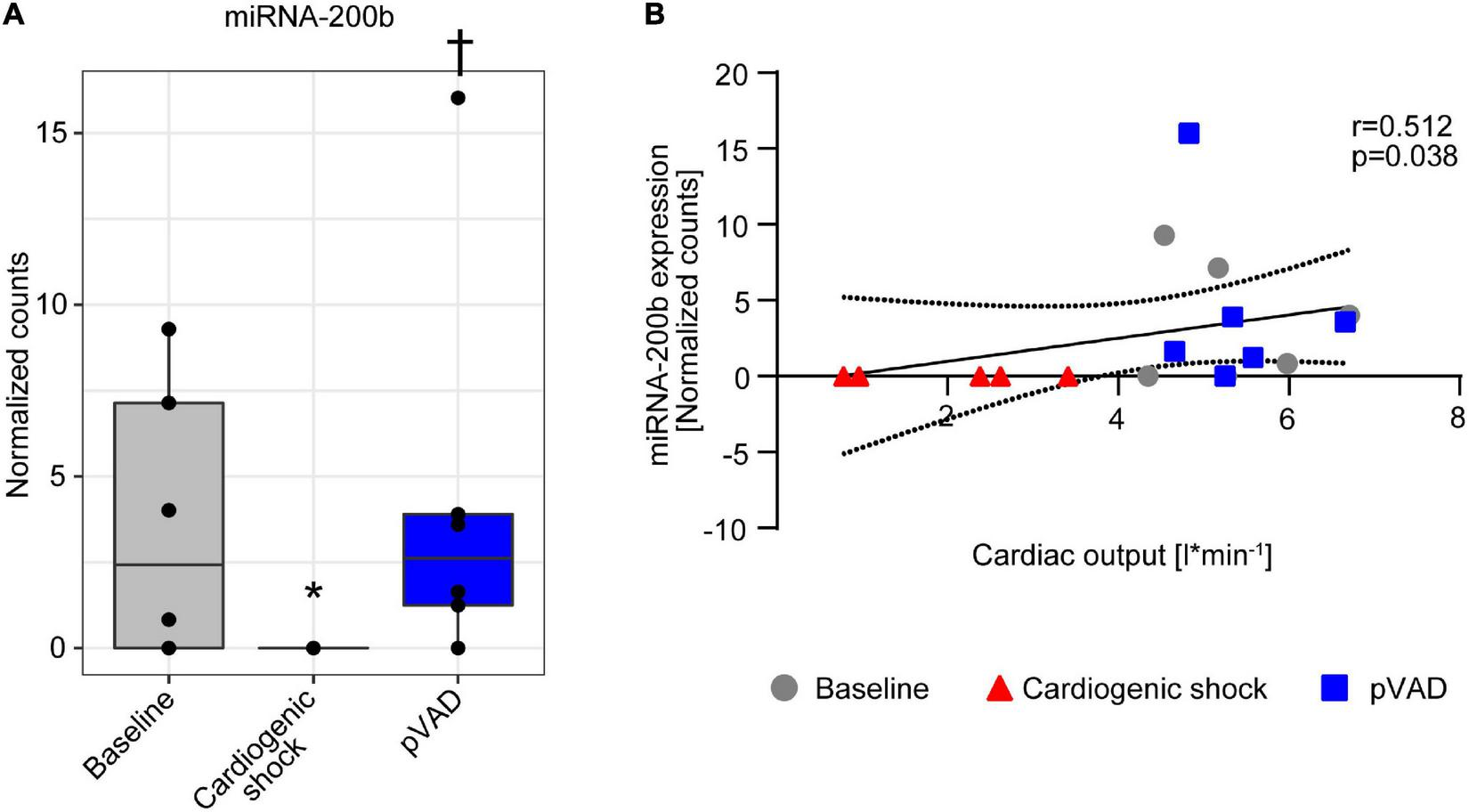 miRNA-200b expression in serum. (A) miRNA-200b expression at time points as indicated. Data are presented as median ± interquartile range (IQR), n = 5–6. *p < 0.05 vs. Baseline; †p < 0.05 vs. Cardiogenic shock; pVAD, percutaneous ventricular assist device. (B) Spearman correlation with 95% confidence intervals calculated by linear regression model between miRNA-200b expression and cardiac output.