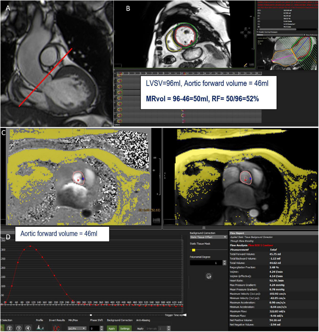 Example of mitral regurgitation (MR) assessment using indirect method n°1. LVOT bSSFP images show the perpendicular line above the aortic valve (red line) indicating the slice position for phase-contrast velocity mapping (A). Assessment of left ventricular stroke volume (LVSV) from short-axis cine SSFP images (B). Phase and magnitude images with delineation of the aorta (C) generating flow curves (D). This patient has a severe MR with a mitral regurgitant volume (MRvol) of 50 ml and a regurgitant fraction (RF) of 52%.