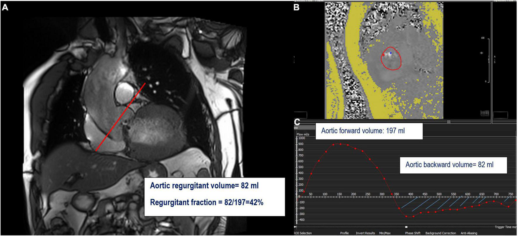 (A) (left) Slice position for the phase-contrast velocity mapping sequence. (B) Flow curve (mL/s) through the aorta at the level of the line on panel (A). Aortic forward volume is calculated as the area under the curve (AUC) of the forward flow on the flow curve (green area); aortic backward volume is calculated as the AUC of the backward flow on the flow curve (orange area). (C) Formula to obtain mitral and aortic regurgitant volume (MRvol and ARvol) and regurgitant fraction (RF) are shown at the left bottom.