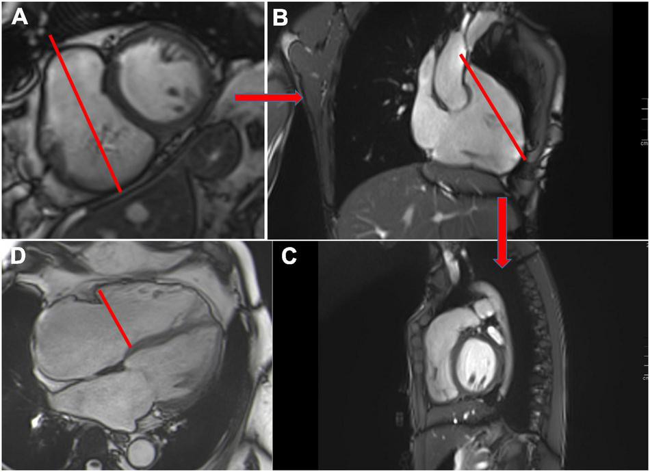Anterior and posterior mitral valves and their scallops (A1, A2 and A3 and P1, P2, P3) visualized in diastole using balanced steady-state free precession (bSSFP) cine images in the plane of the mitral valve (A). Cine 4 chamber view in a patient with posterior and anterior mitral valve prolapse (red arrows) (B). Example of mitral annular measurement from the anterior commissure to the posterior commissure (red line) in the 2-chamber view (C). A central mitral regurgitation (flow void in the left atrium, red arrow) secondary to mitral annular dilatation visualized in the 4-chamber view (D).