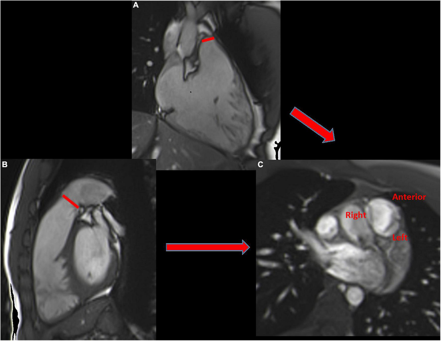 Leaflet motion abnormalities can be described as classically defined by echocardiography (prolapse, flail) (Figure 1). However, a flail leaflet in CMR can be masked by the regurgitant flow. Maximum mitral leaflet thickness is measured in diastole. Standard long-axis cine images are also informative for visualizing and sizing the mitral annulus (14). With CMR reference ranges, mitral annular dilatation, one of the mechanisms in secondary MR, can be identified. The mitral annular diameter is measured from the anterior commissure to the posterior commissure in the diastole (Figure 1). In primary MR (mitral valve prolapse especially), CMR can detect mitral annulus disjunction, a frequent component of myxomatous mitral valve disease (15) using standard long-axis cine images.