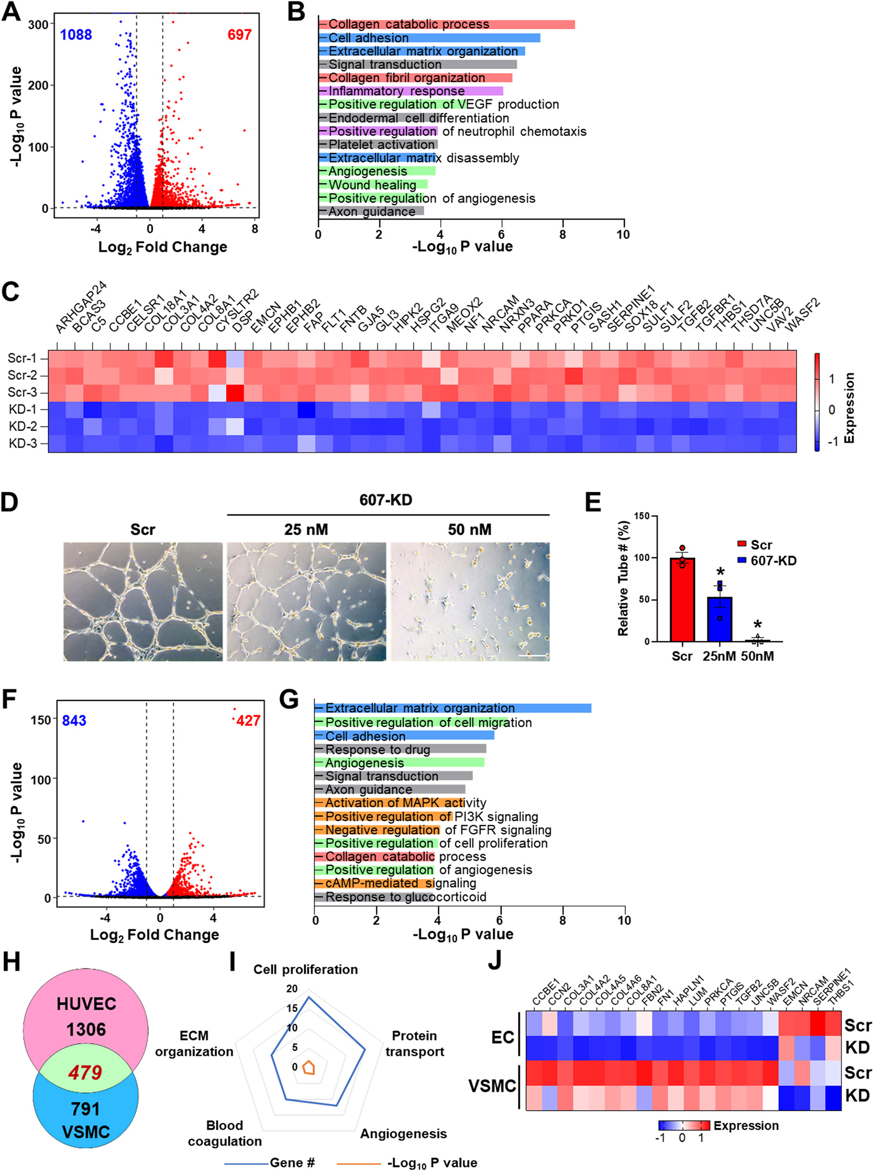 LINC00607 regulates basal EC and VSMC function. (A) Volcano plot indicating the DEGs upon 607-KD in HUVECs. Red and blue dots represent significantly up-regulated and down-regulated genes (with P-value cut-off of 0.01). Vertical dotted lines correspond to 2-fold differences. (B) Pathway enrichment analyses of DEGs upon 607-KD in HUVECs. Top 15 GO terms ranked by fold enrichment score for both the down- and up-regulated DEGs. (C) Expression of select down-regulated DEGs involved in angiogenesis due to LINC00607 knockdown (KD), as compared to scramble LNA (Scr). Heatmap is plotted based on z-scaled gene expression levels. (D) Representative images of tube formation of HUVEC transfected with either scramble or 607-KD at the indicated final concentration. The images were taken after incubating in Matrigel for 4 h. Scale bar = 100 μm. (E) Quantitative data of tube formation represented by numbers of tubes in randomly selected views. (F) DEGs upon 607-KD in VSMCs were plotted as in (A). (G) Pathway enrichment analyses of DEGs upon 607-KD in VSMCs. Top 15 GO terms are plotted as in (B). (H) Venn diagram showing the number of common DEGs upon 607-KD in HUVECs and VSMCs (in green). Numbers of unique DEGs in each cell type (pink for HUVECs and blue for VSMCs) are indicated. (I) Polygon radar chart showing the top 5 enriched pathways of the common DEGs in HUVECs and VSMCs. Data values for each vertex represent the number of DEGs classified in the indicated gene pathway in blue and the P-value (in -log10) in orange. (J) Expression heatmap of representative DEGs commonly affected by 607-KD in ECs and VSMCs.