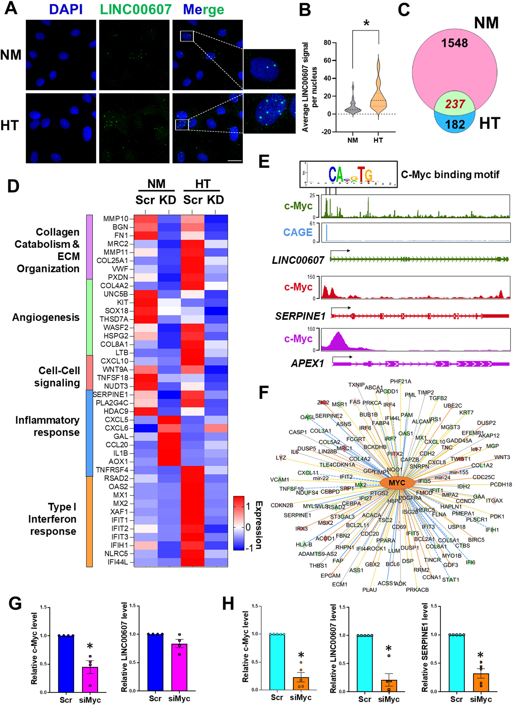To further test whether c-Myc regulates LINC00607, we knocked down c-Myc in HUVECs by small interference RNAs (siRNAs) as confirmed by immunoblotting (Supplementary Figure 6). While c-Myc inhibition did not significantly affect the expression of LINC00607 under basal conditions (Figure 3G), there was a strong reduction in LINC00607 expression upon c-Myc inhibition under HT (Figure 3H). Consistently, the expression of SERPINE1, a proven regulatory target of LINC00607 and c-Myc, was also downregulated upon c-Myc inhibition (Figure 3H). Taken together, c-Myc appears to be a TF controlling the expression of LINC00607, which may act as an integral regulator in the c-Myc transcriptional network especially in the dysfunctional ECs.