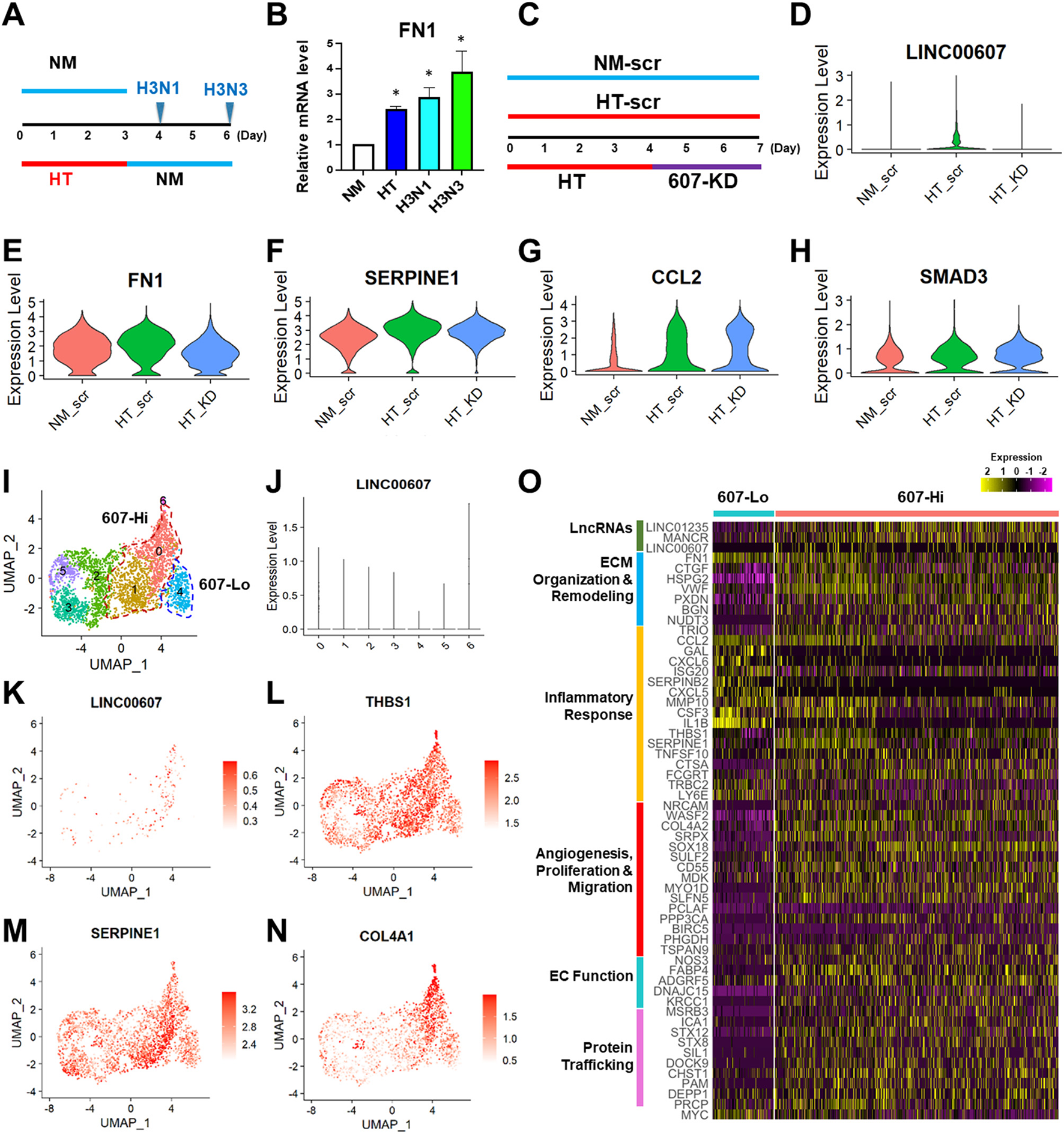 LINC00607 inhibition reverses the effect of HT in ECs. (A) Experimental design of HT to NM switch experiment. HUVECs were treated with NM or HT for 3 days, and then switched to NM medium for another 1 (H3N1) or 3 days (H3N3) before cell harvest. (B) qPCR detection of FN1 mRNA levels from experiment shown as in (A). (C) Experimental design of the “reverse” experiment. HUVECs in biological replicates were treated with NM or HT for 7 days, or HT for 4 days before LINC00607 knockdown using LNA GapmeR (607-KD). (D) LINC00607 expression quantified by scRNA-seq of three groups of ECs. (E–H) Representative reversible (FN1 and SERPINE1) and irreversible (CCL2 and SMAD3) DEGs. (I) UMAP of HT-KD scRNA-seq data. (J) LINC00607 expression in HT-KD samples shown on UMAP separated by 7 clusters. Note that Cluster 0, 1, and 6 show high LINC00607 levels (expression level >1, i.e., 607-Hi cells) and Cluster 4 shows the lowest LINC00607 level (i.e., 607-Lo cells). (K) LINC00607 expression in 7 clusters of cells in HT-KD samples plotted by UMAP. (L–N) Representative DEGs in HT-KD samples plotted on UMAP. (O) Heatmap showing the expression of indicated DEGs in LINC00607-Lo vs. -Hi ECs.