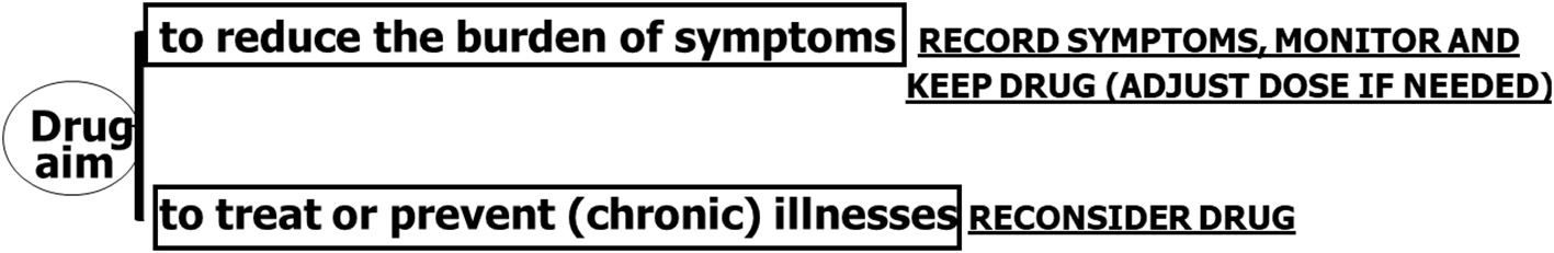 Transition of the goals of care toward improving comfort and focusing on alleviating symptoms requires a continuous communication with patients and their families. The validity of former indications for their use, after setting new goals, should be evaluated. Treatments relevant for symptom management (or prevention) should be continued unless relevant side effects appear. On the other hand, cardiovascular drugs prescribed for conditions that are becoming no longer relevant should be considered for withdrawal. Therapies causing adverse effects and most preventive drugs, especially those with a long delay in showing their benefits should be stopped. The simple message would be to maintain drugs that reduce the burden of symptoms (while recording these symptoms) and to reconsider drugs used to treat or prevent (chronic) illnesses (Figure 1). Therefore, routinely stopping cardiovascular drugs when starting palliative care is inappropriate, as many drugs are important for symptoms control.