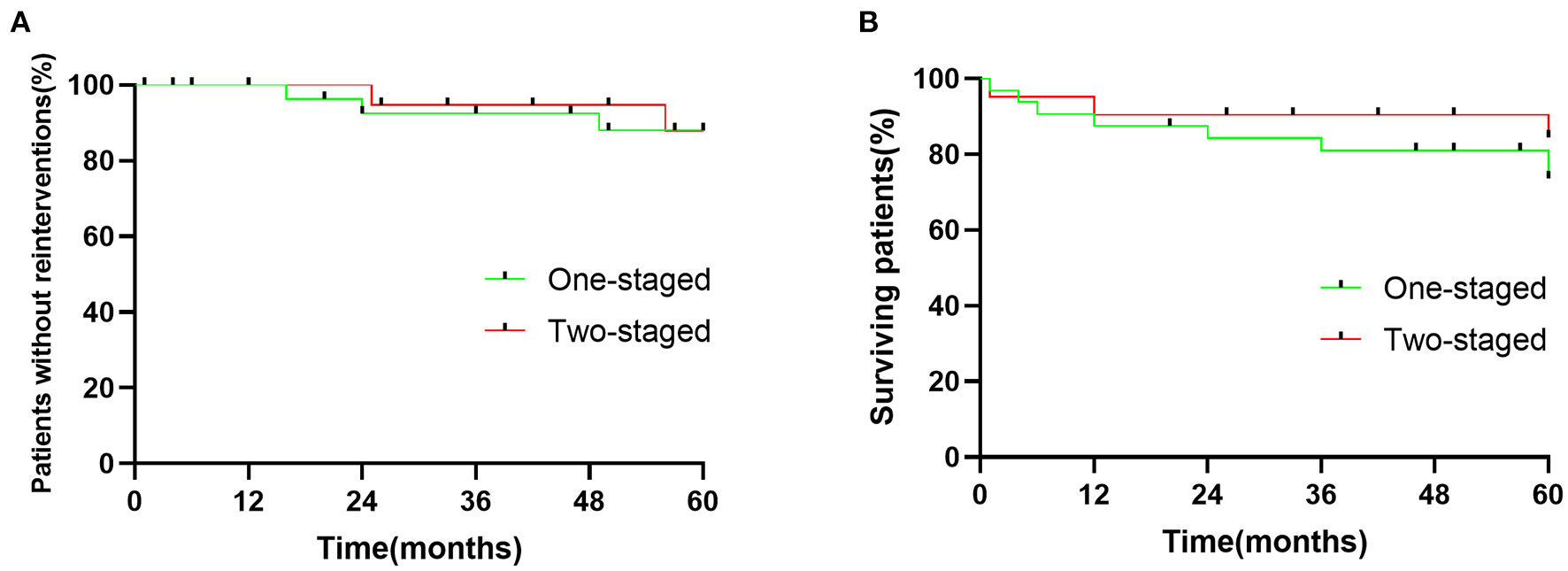 (A) Cumulative Kaplan-Meier estimate of patients without reinterventions after endovascular repair of multilevel lesions via one-staged and two-staged repair. p = 0.9006. (B) Cumulative Kaplan-Meier estimate surviving rate of patients after endovascular repair of multilevel lesions via one-staged and two-staged repair. p = 0.4939.