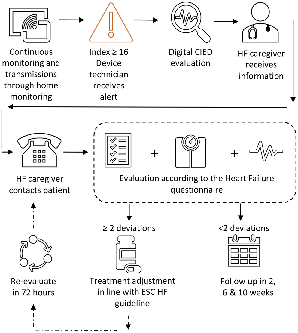 All adult heart failure patients with a CIED implanted (de novo implants and pulse generator exchanges) from 01-01-2018 onwards and an active and calibrated HeartLogicTM algorithm who were under follow-up at the Leiden University Medical Center until 01-05-2021, the Netherlands, were eligible for inclusion. Basic Dutch or English-speaking skills were necessary for inclusion. Patients with a Left Ventricular Assist Device (LVAD) or unwillingness to comply to the HeartLogicTM heart failure care path were excluded from analysis.