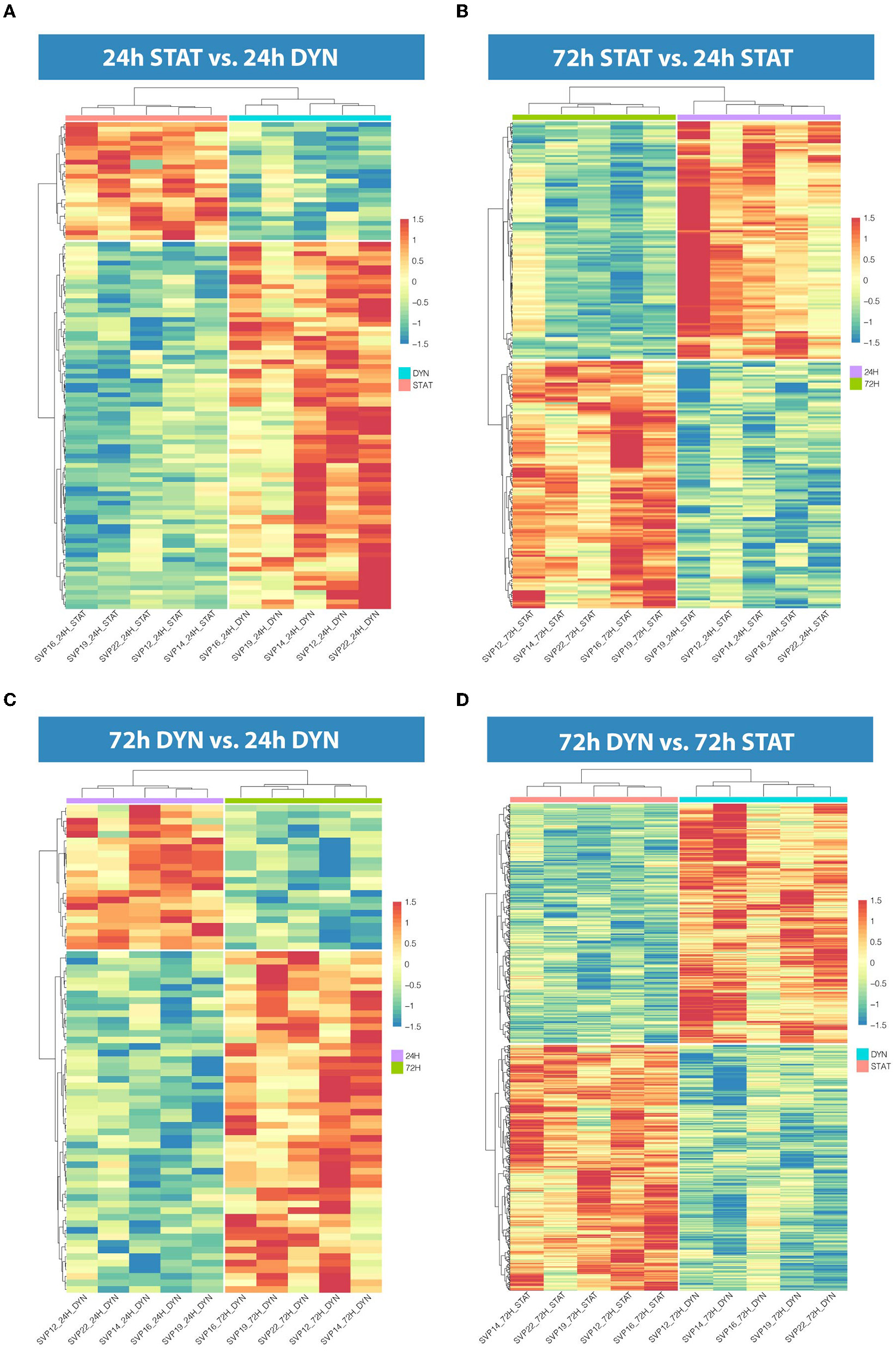 Hierarchical clustering in the four comparisons. (A) Heatmap representation showing 103 DEGs in 24 h dyn vs. 24 h stat. (B) Heatmap representation showing 245 DEGs in 72 h stat vs. 24 h stat. (C) Heatmap representation showing 72 DEGs in 72 h dyn vs. 24 h dyn. (D) Heatmap representation showing 819 DEGs in 72 h dyn vs. 72 h stat. For all heatmaps BH-adjusted p-value ≤ 0.05.