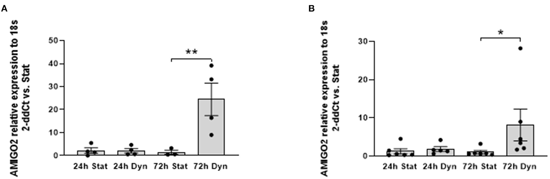 RNA-seq validation. Bar graphs showing relative expression of AMIGO2 in SVPs after mechanical stimulation assessed by real-time qPCR. (A) Analysis performed in the same samples of the RNA-Seq (N = 5); difference among groups are evaluated using one-way ANOVA for normal distributed values, based on the result of normality tests. (B) Analysis performed using SVPs obtained from a new set of donors (N = 7), statistical analysis conducted using Kruskal–Wallis test for not normal distributed values, based on results from normality tests. Data are presented as mean ± SEM of 2-ddCt vs static (Stat) condition of each time point, *p < 0.05 **p < 0.01 (t-test stat vs. dyn).