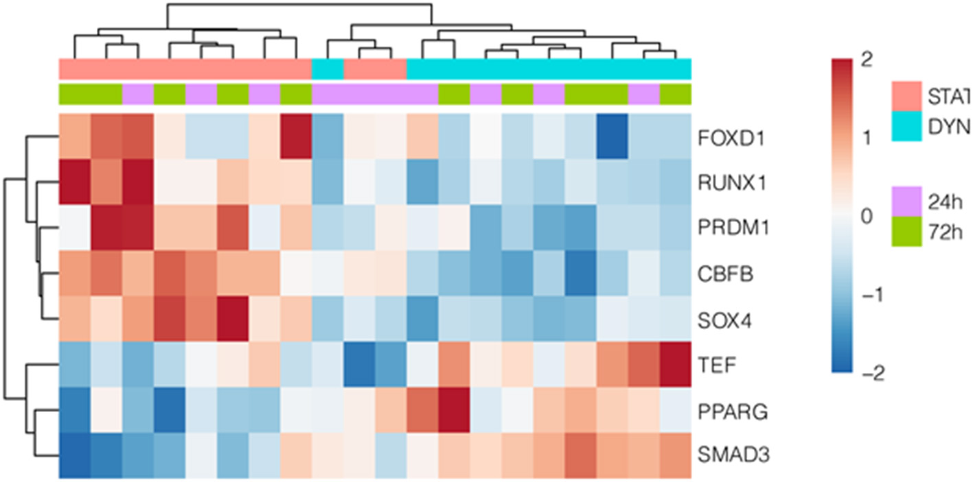 Motif-based TF prediction was performed in Cytoscape (version 3.8.0) running iRegulon App (25) on the complete set of differentially expressed genes in the dynamic vs. static conditions, with the following parameters: Motif collection = 10 K (9,713 PWMs), Track collection = 1,120 ChIP-seq tracks (ENCODE raw signals), min NEScore = 2, ROC threshold for AUC calculation (% = 3), max FDR = 0.05, Motif rankings database = 20 kb centered around TSS (7 species), Track rankings database = 20 kb centered around TSS (ChIP-seq derived).